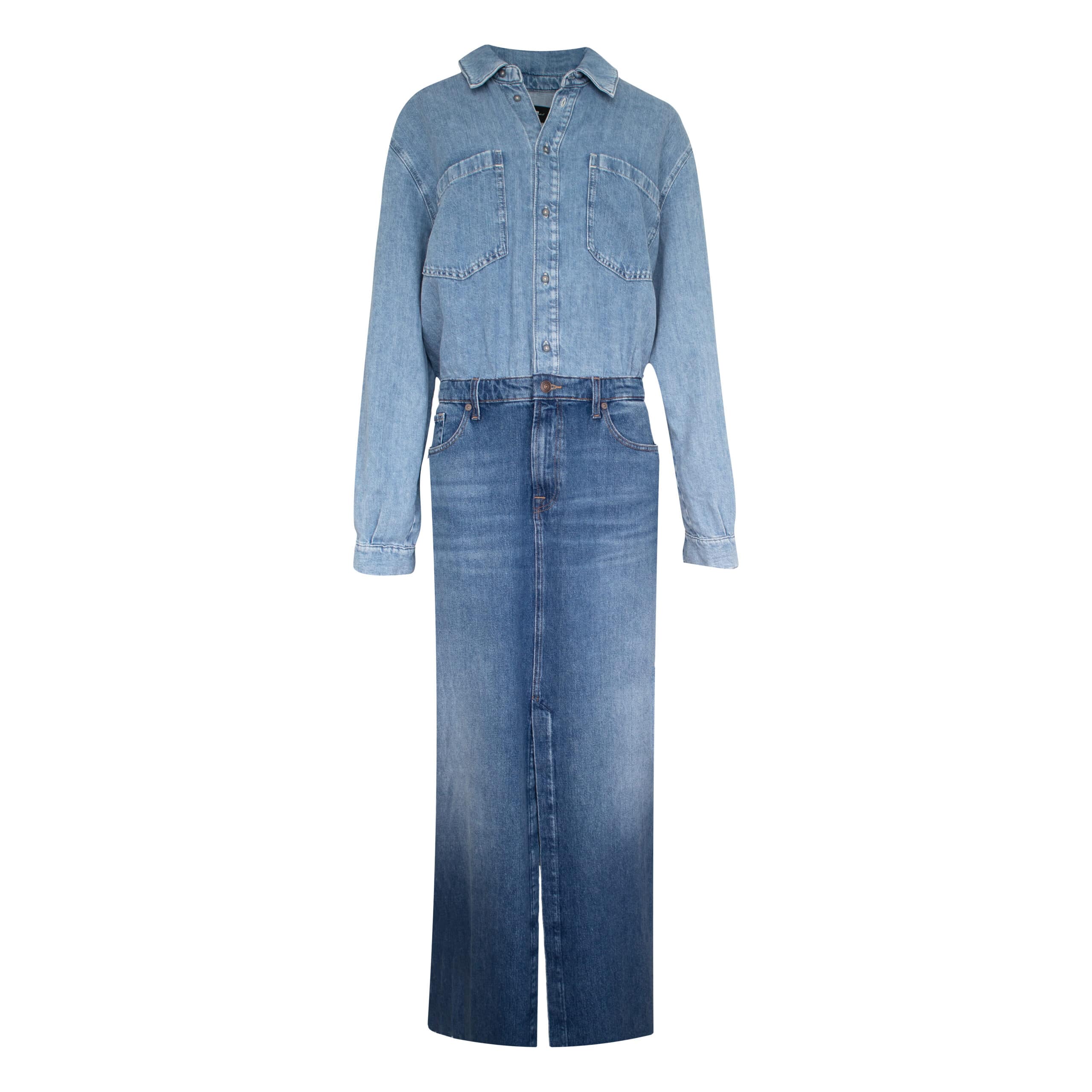Blauwe maxi jurk van 7 for all Mankind, model Maxi dress in ipanema wash mid blue. Deze relaxte jurk is gemaakt van denim, heeft een gerafelde zoom en een split aan de voorzijde. De jurk heeft contrasterende wassingen, waardoor het de indruk wekt van twee verschillende kledingstukken, sluit met een knoop- en ritssluiting, heeft twee steekzakken en twee achterzakken.