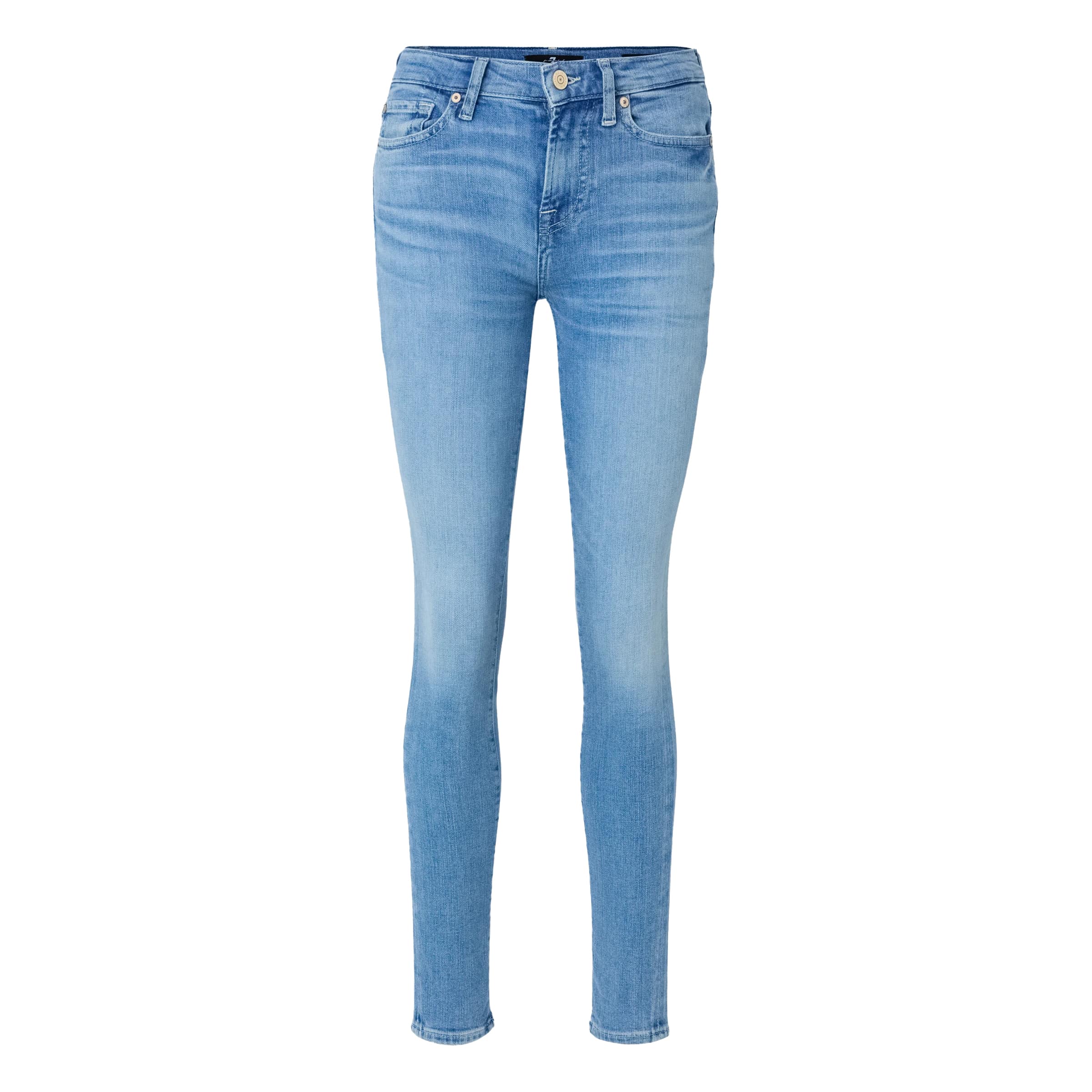 Lichtblauwe jeans van 7 for all Mankind, model The Skinny met een slim illusion mare wassing in light blue. Deze jeans is gemaakt van blauwe stretch denim en heeft een skinny pasvorm. De jeans sluit met een knoop- en ritssluiting, heeft twee steekzakken, twee achterzakken en een normale taille.