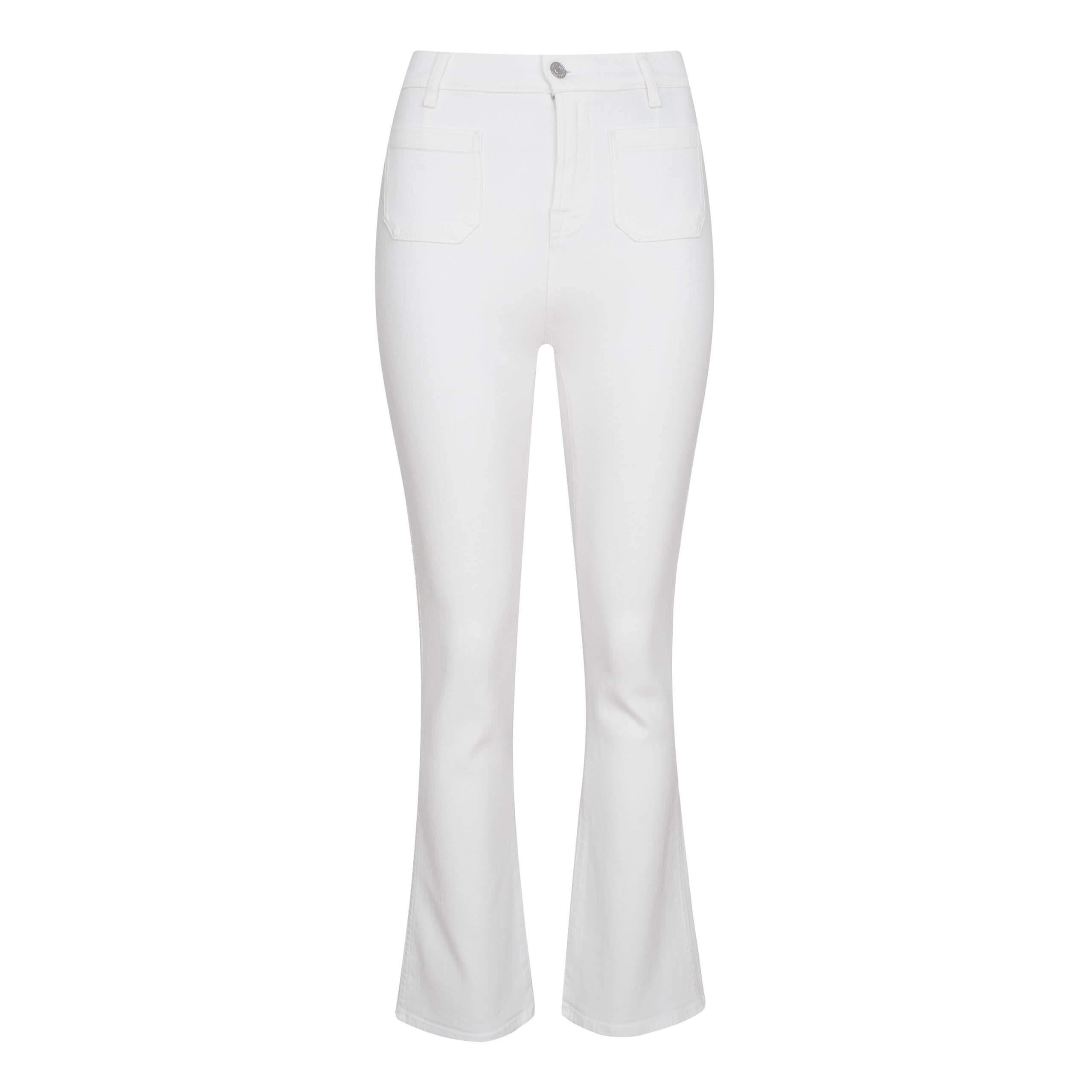 Witte jeans van 7 for all Mankind, model HW (high waist) slim kick love again with patch pockets in white. Deze jeans is gemaakt van witte denim stretch stof en heeft een hoge taille en een slim kick aan de onderzijde. De jeans sluit met een knoop- en ritssluiting, heeft twee pocketzakjes aan de voorzijde en en twee achterzakken.