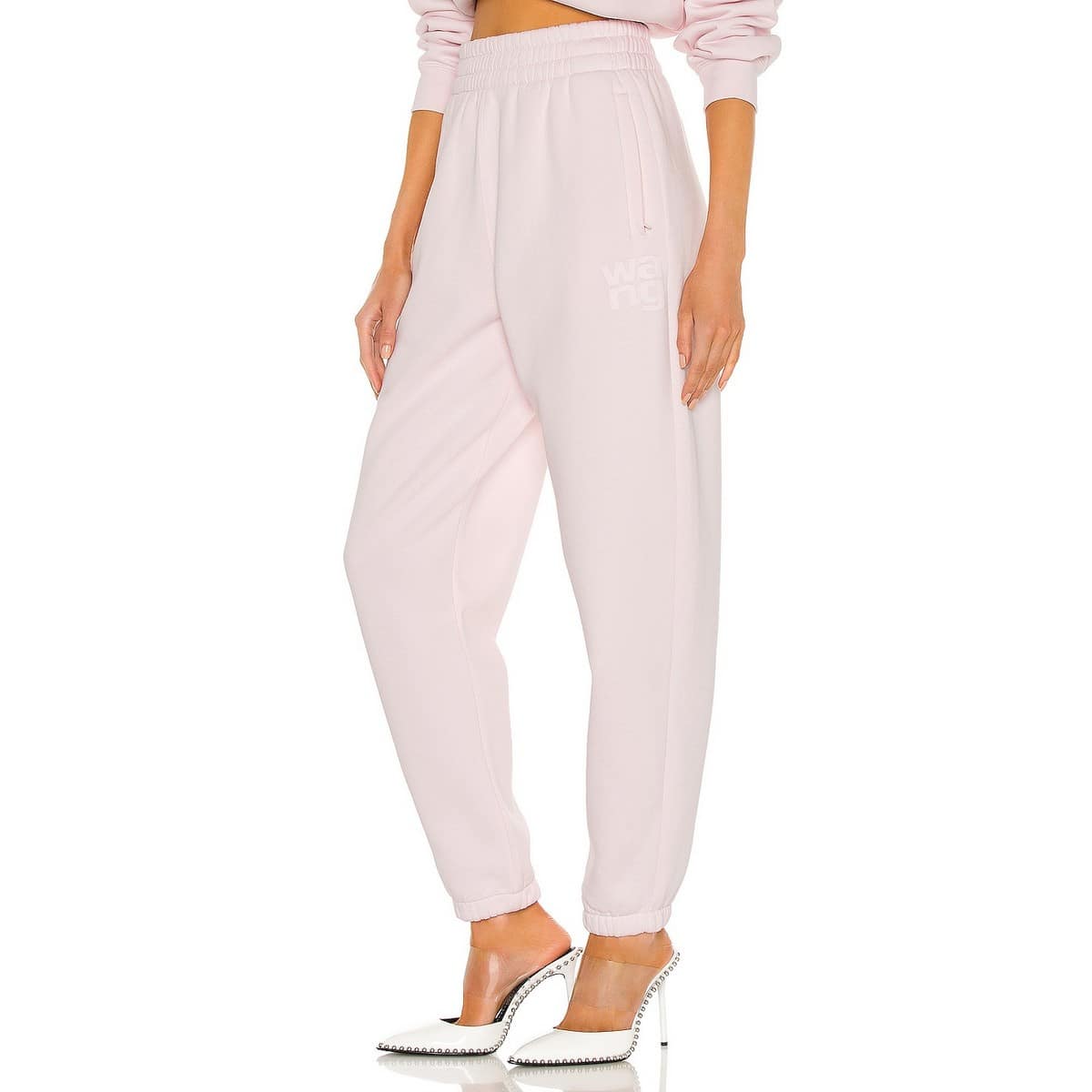 Relaxte sweatpants van AlexanderWang.T, model foundation terry classic sweatpant puff paint logo. Deze broek heeft een elastische taille en twee steekzakken die afgesloten kunnen worden met een rits. Aan de linkerzijde van de sweatpants is Wang op de broekspijp geprint. De broek heeft een effen lichtroze kleur primerose pink, hoge taille, wijde pasvorm met een zachte fleece voering aan de binnenzijde.