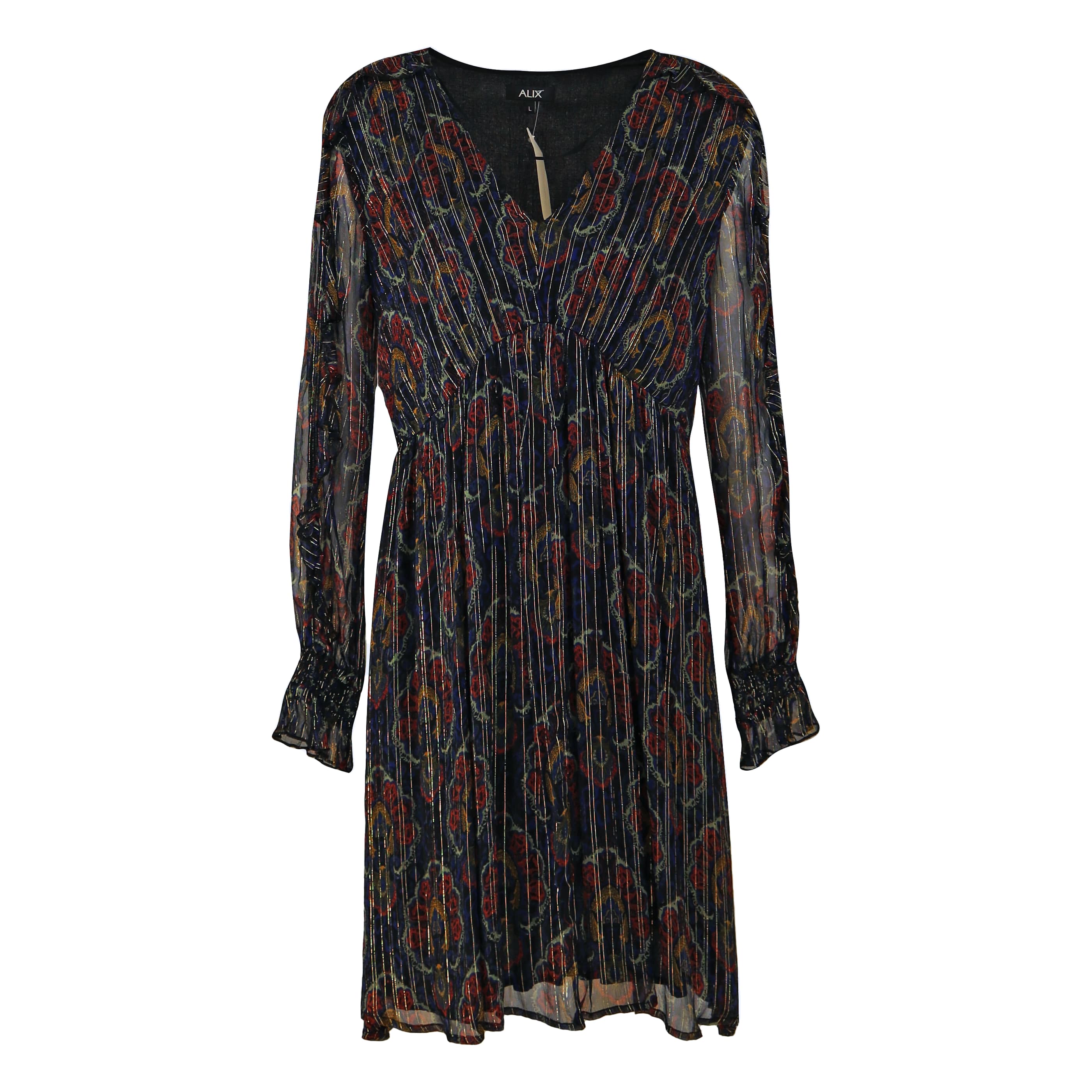 Kort kleedje van Alix the label. Deze jurk is gevoerd en heeft een zwarte basis met een print van blauw, bruin, geel en groen. Over de gehele jurk loopt een gouden metalic draad. De jurk heeft een verhoogde taille, V-hals, ruches op de schouders die doorlopen op de lange licht doorschijnende mouwen met elastische manchetten.