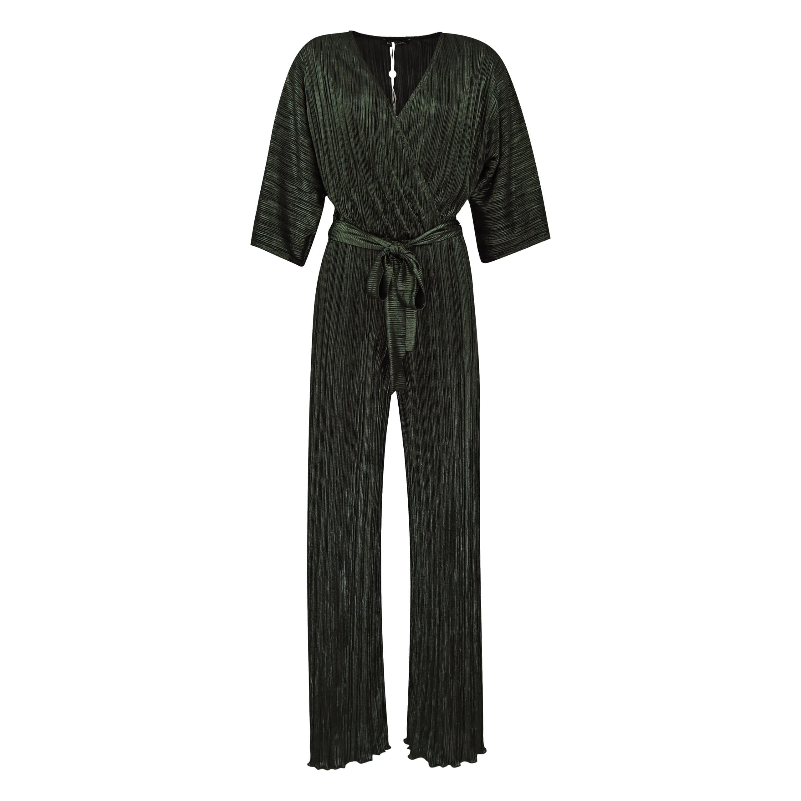 Groene plissé jumpsuit van Ana Alcazar, model Ogrea. Deze jumpsuit is gemaakt van een groene fijn geplooide stof en heeft een elastische taille. De jumpsuit heeft een overslag met V-hals, bijpassende ceintuur, twee steekzakken en halve mouwen.