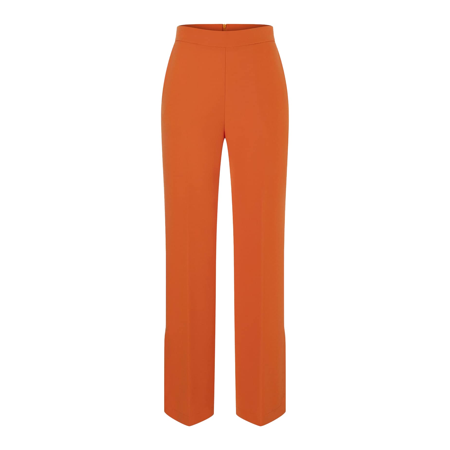Oranje pantalon van Ana Alcazar, model Pabari. Deze pantalon is gemaakt van een dunne gladde stretch stof en heeft rechte broekspijpen met onderaan een split. De pantalon sluit met een verborgen ritssluiting aan de achterzijde, hoge taille en heeft twee steekzakken.