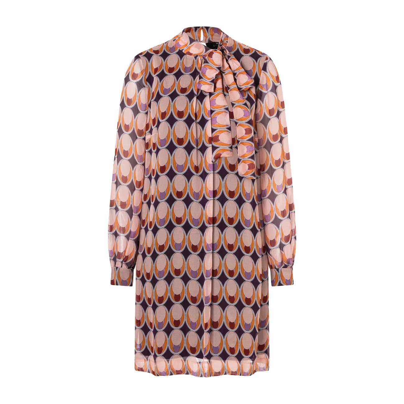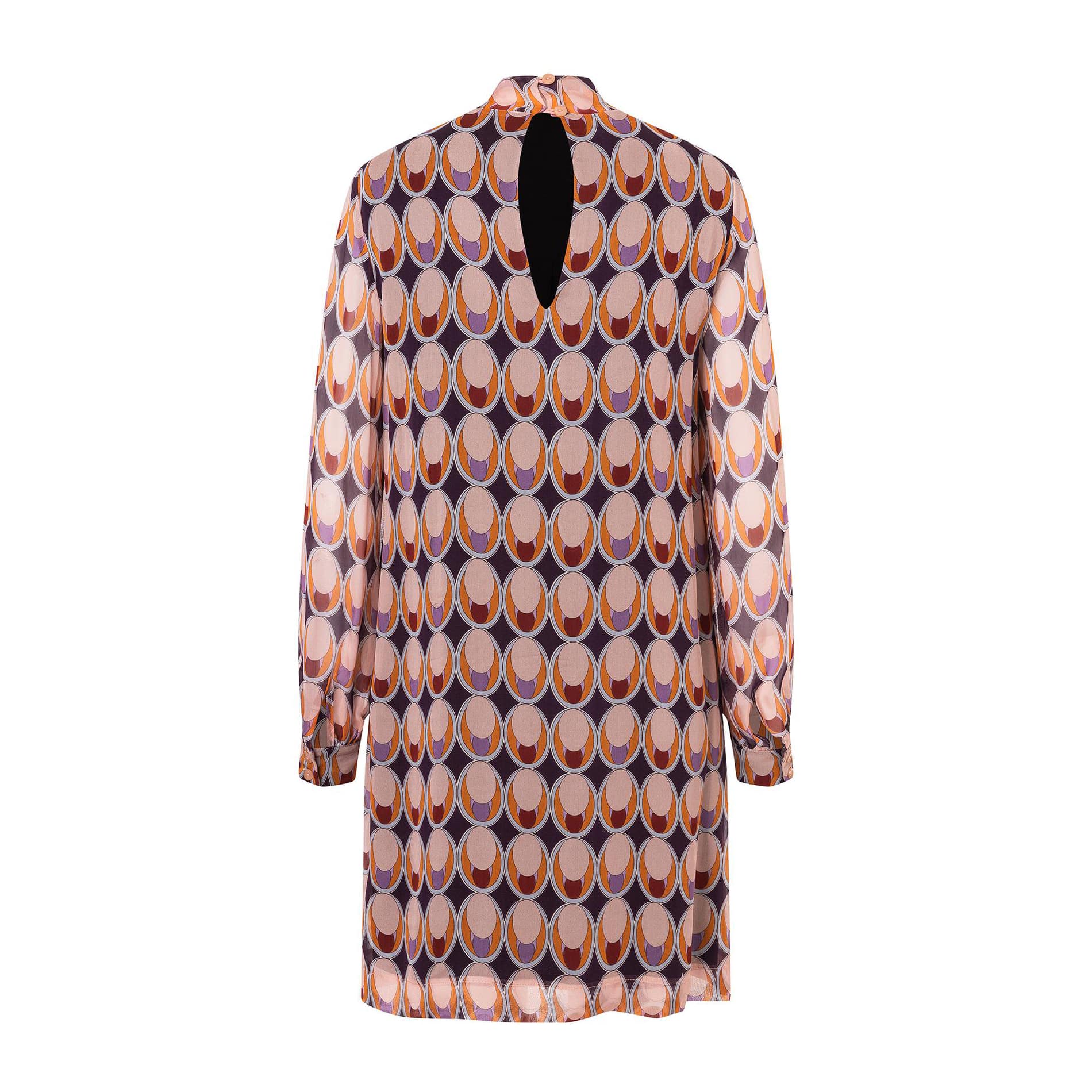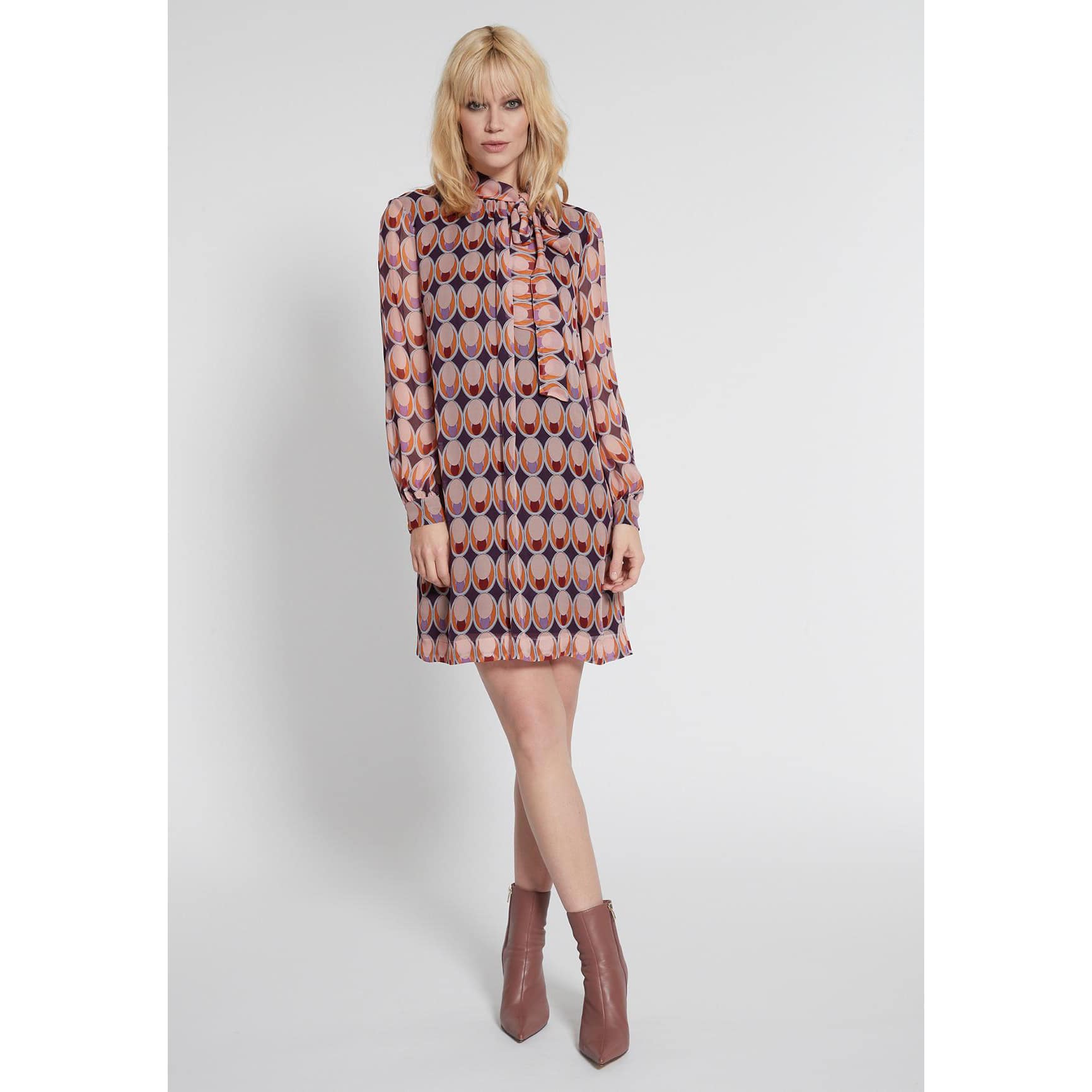Kort kleedje van Ana Alcazar, model Hagra. Deze gevoerde jurk is gemaakt van chiffon met een roze ovalen motief en heeft een rechtvallende A-lijn pasvorm. De jurk sluit met twee knoopjes in de hals met daaronder een keyhole en heeft een elegante strik op de schouder.
