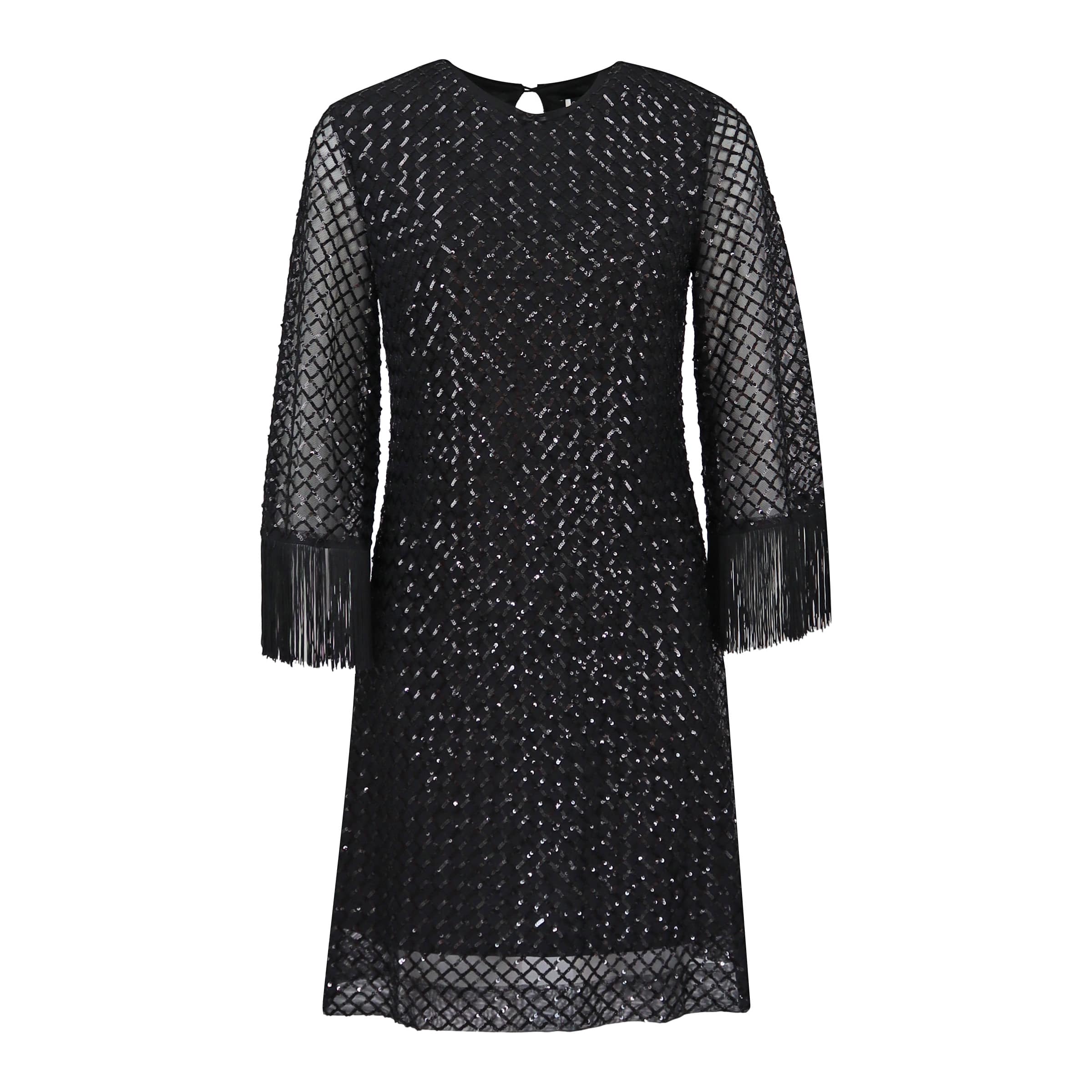 Zwart kleedje van Ana Alcazar. Deze zwarte jurk is bezet met zwarte pailletten in een ruitvorm en valt boven de knie. De jurk sluit met eem knoopjes in de hals aan de achterzijde, heeft driekwart mouwen met franjes en heeft een licht uitlopende rok.