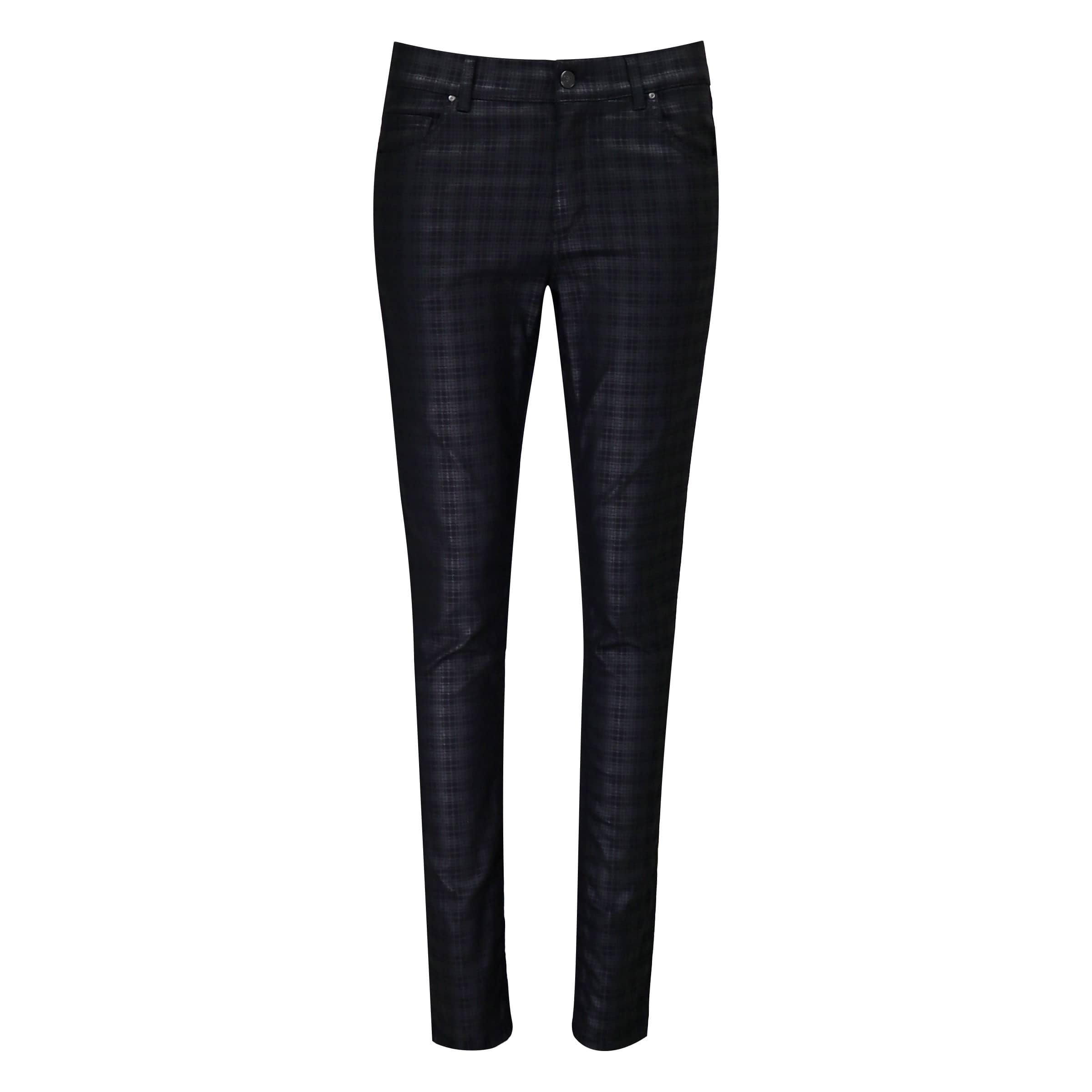 Zwarte pantalon van Angels, model Skinny regular. Deze broek is gemaakt van een zwarte geruite coated stof en heeft een normale taille. De jeans sluit met een knoop- en ritssluiting, heeft twee steekzakken en twee achterzakken.