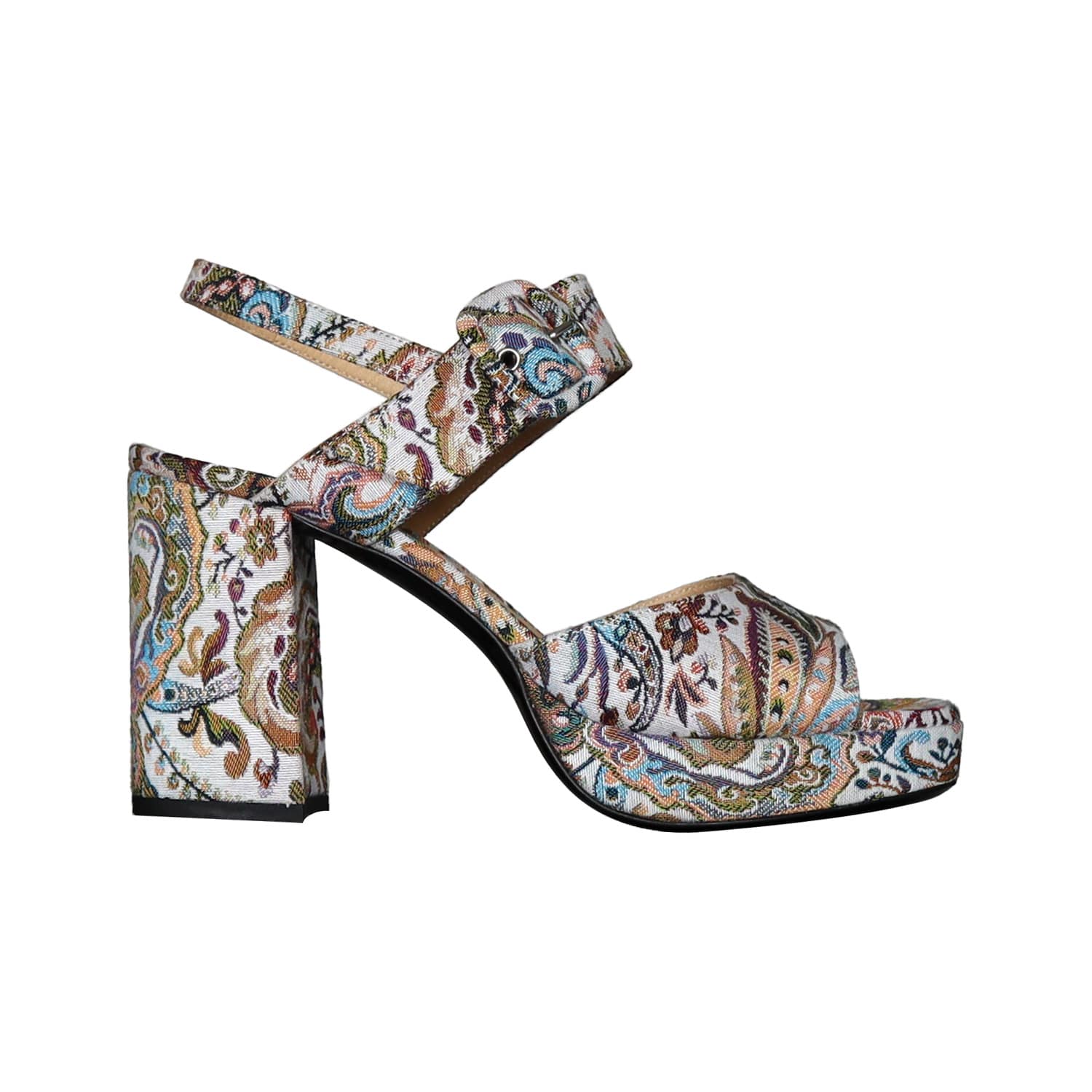 Fleurige sandalen van Barbara Bui. Deze open sandalen hebben een leren plateau zool van 2 cm, een leren binnenzijde, hakken van ongeveer 10 cm. en is bezet met een paisley stof. De sandalen sluiten met een ceintuurtje over de wreef en hebben een open achterzijde.