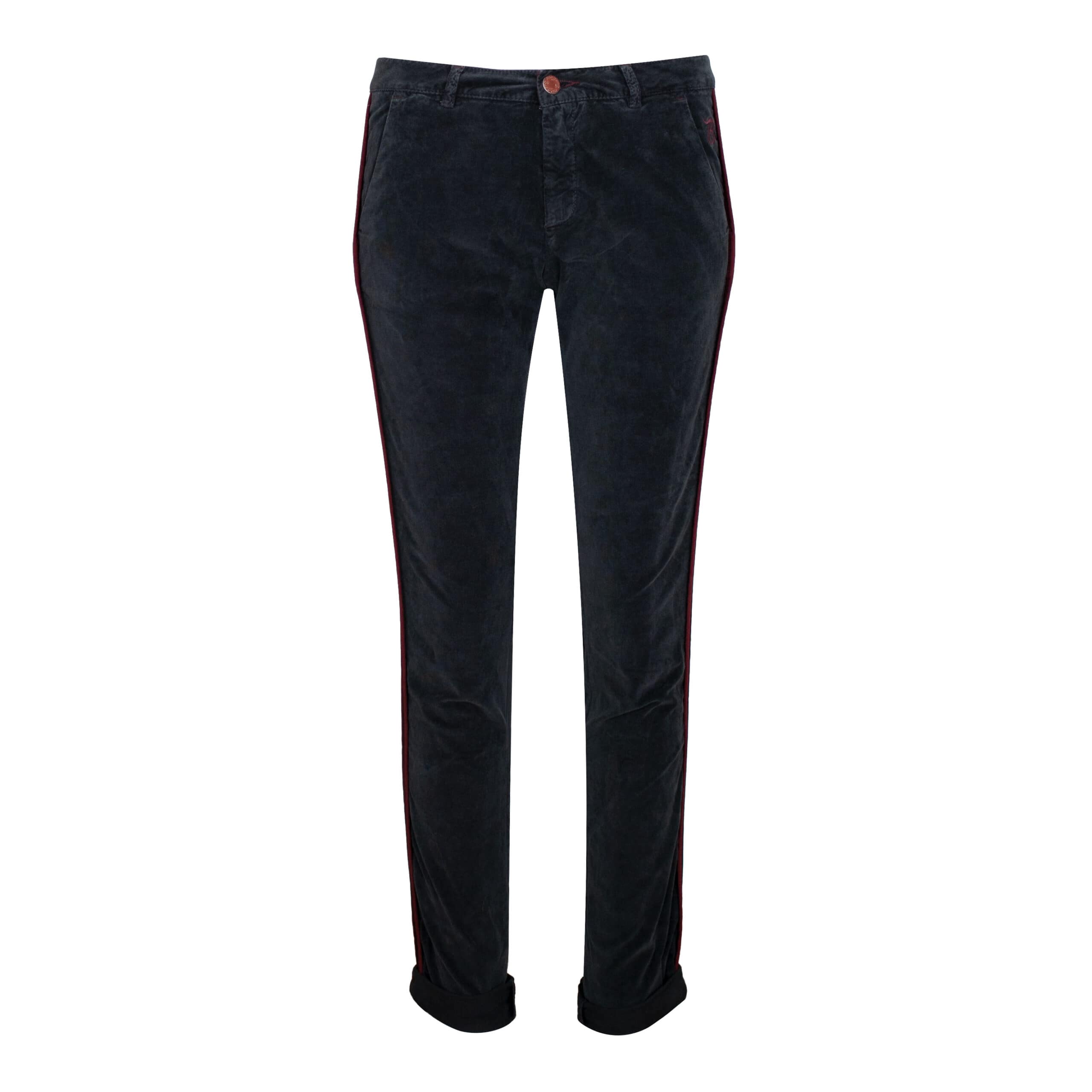 Fluwelen chino van Barb’one, model Mia in antraciet. Deze pantalon is gemaakt van een antracieten fluwelen stretch stof met een bordeaux rode bies, heeft een slim fit pasvorm, vaste omslag en valt tot op de enkels. De broek sluit met een knoop- en ritssluiting, heeft twee steekzakken aan de voorzijde en twee sier paspelzakjes.