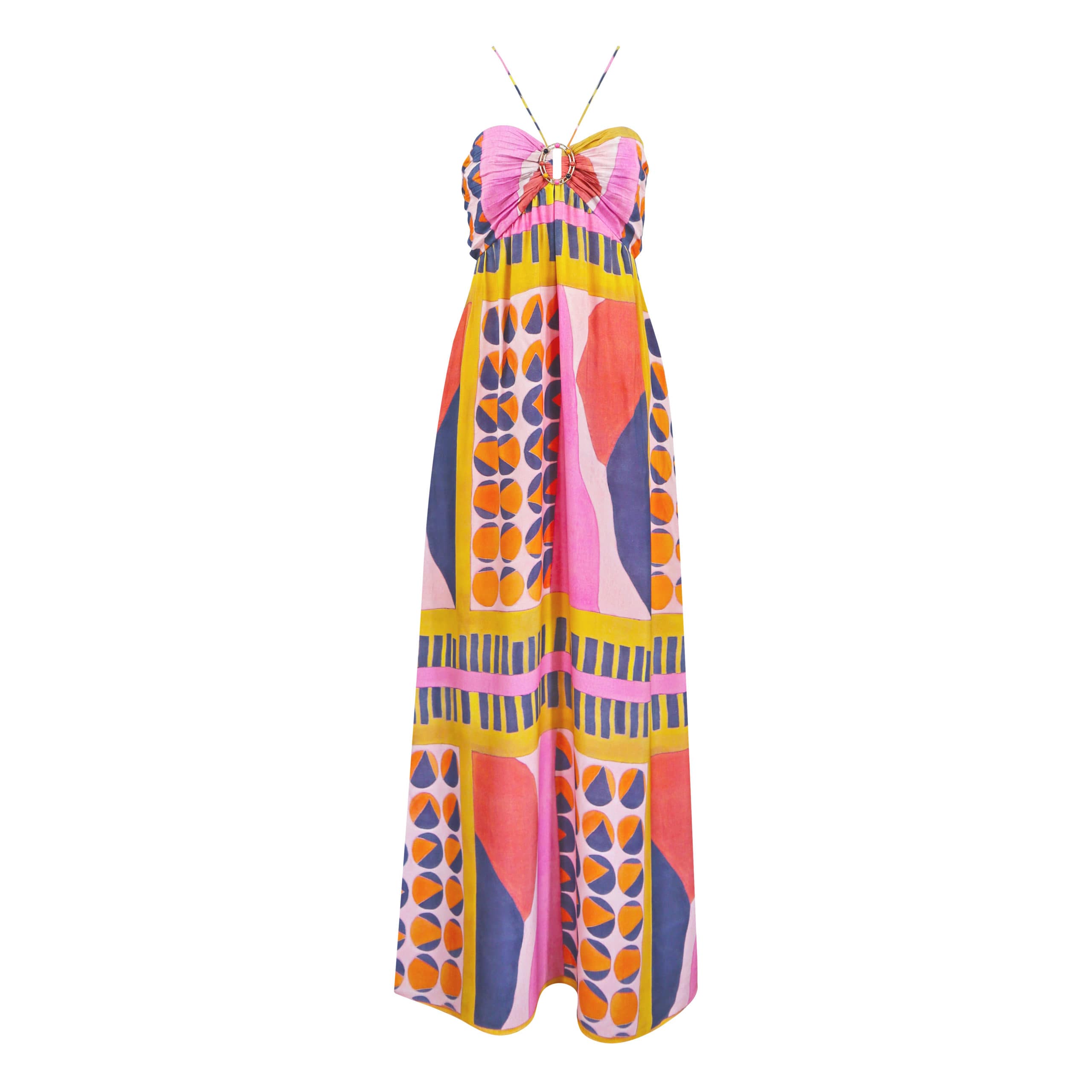 Maxi kleedje van Ba&sh, model Molly in rose. Deze strapless jurk is gemaakt van een stof met bohemian chic print en heeft een los vallende pasvorm. De jurk heeft aan de voorzijde een ronde metalen ring met steentjes waar de koordjes voor om de hals aan vast zitten. Aan de achterzijde heeft de jurk een open rug en koordjes om het bovenstuk vast te maken.