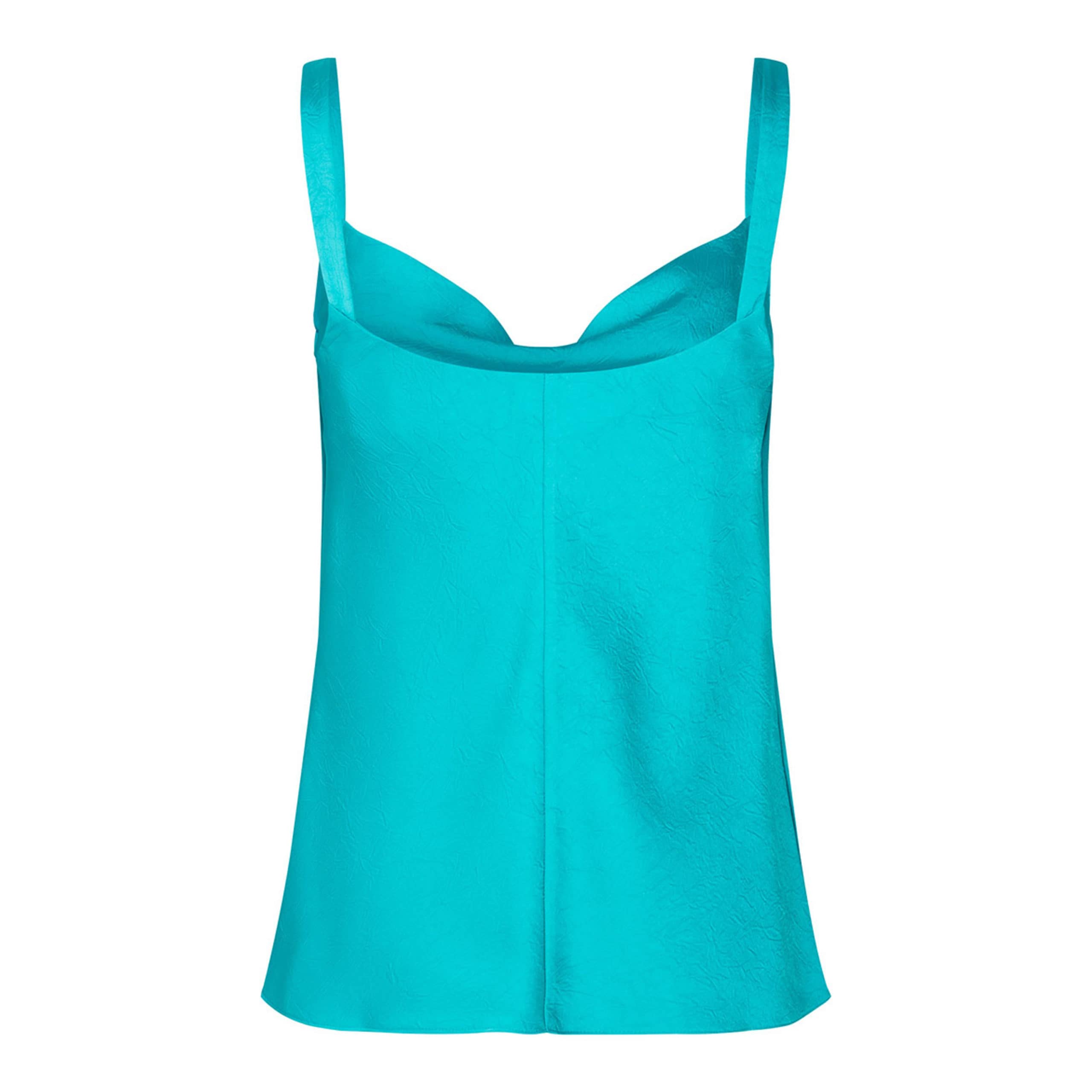 Blauwe top van Baum und Pferdgarten, model Magama in peacock blue. Deze top is gemaakt van een satijnen stof met structuur en heeft een normale pasvorm. De top heeft een gedrapeerde voorzijde met schouderbandjes.