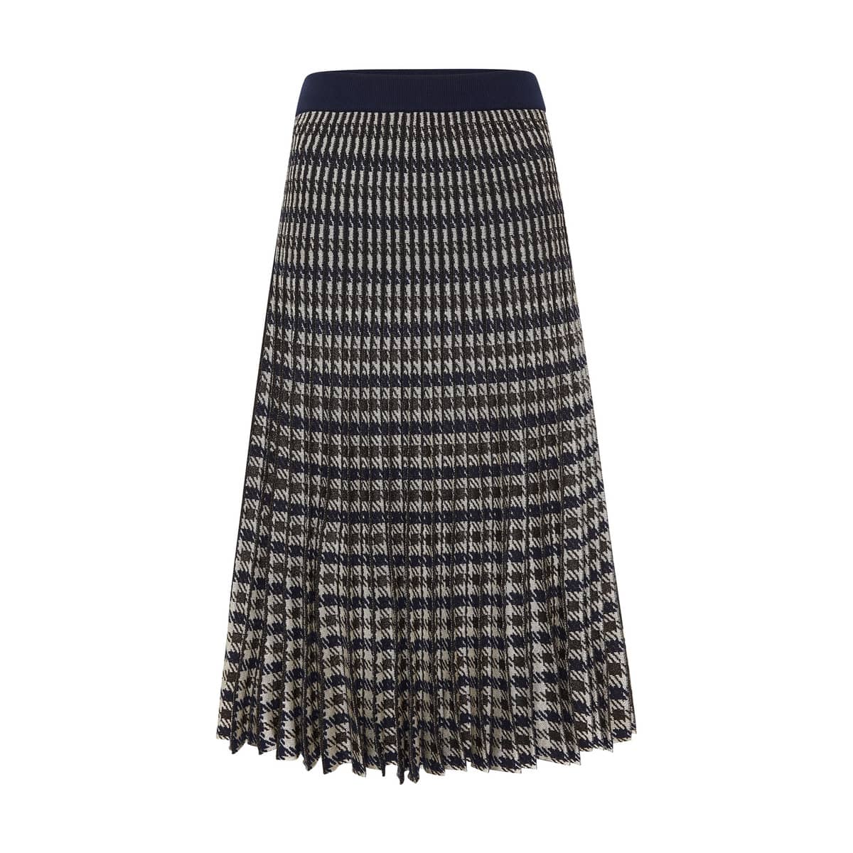 Midi rok van Baum und Pferdgarten, model Cyrilla in brown blue houndstooth. Deze midi rok is gevoerd, gemaakt van een stretch stof met metalic details en heeft een pied-de-poule motief. De rok heeft een elastische taille met een uitlopende pasvorm met plooien.