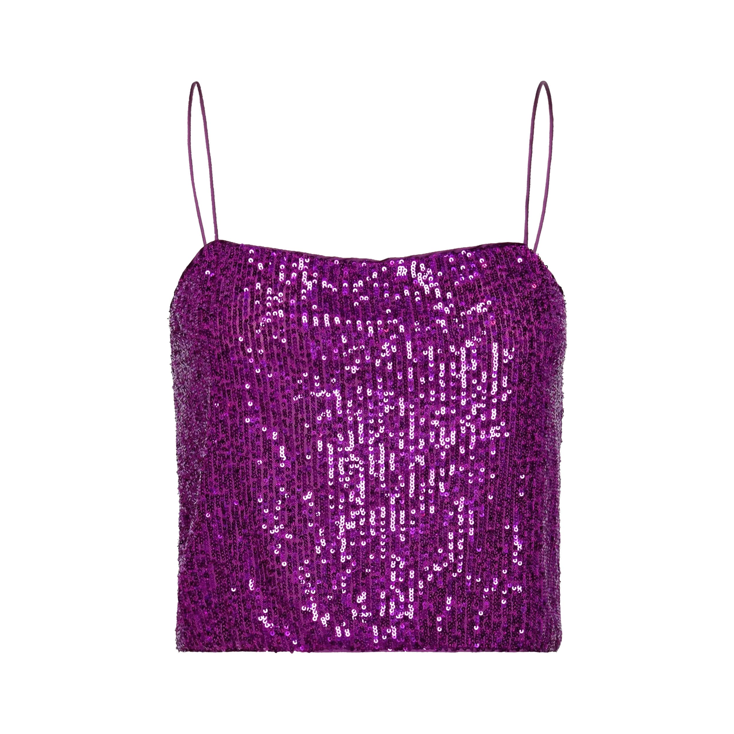Paarse pailletten top van Baum und Pferdgarten, model Jovana in violet sequin. Deze korte top heeft een voering met een bovenlaag die bestaat uit paarse pailletten. De top heeft spaghetti bandjes en valt kort.