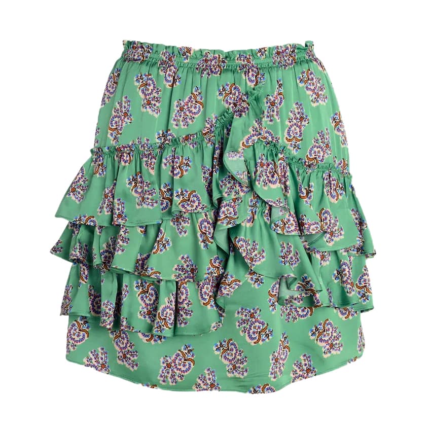 Korte rok van Bernice, model jupe courte imp volants Jolene. Deze mini rok is gemaakt van een groene satijnen stof met een bloemen print. De rok heeft een elastische taille en sierlijke volants.