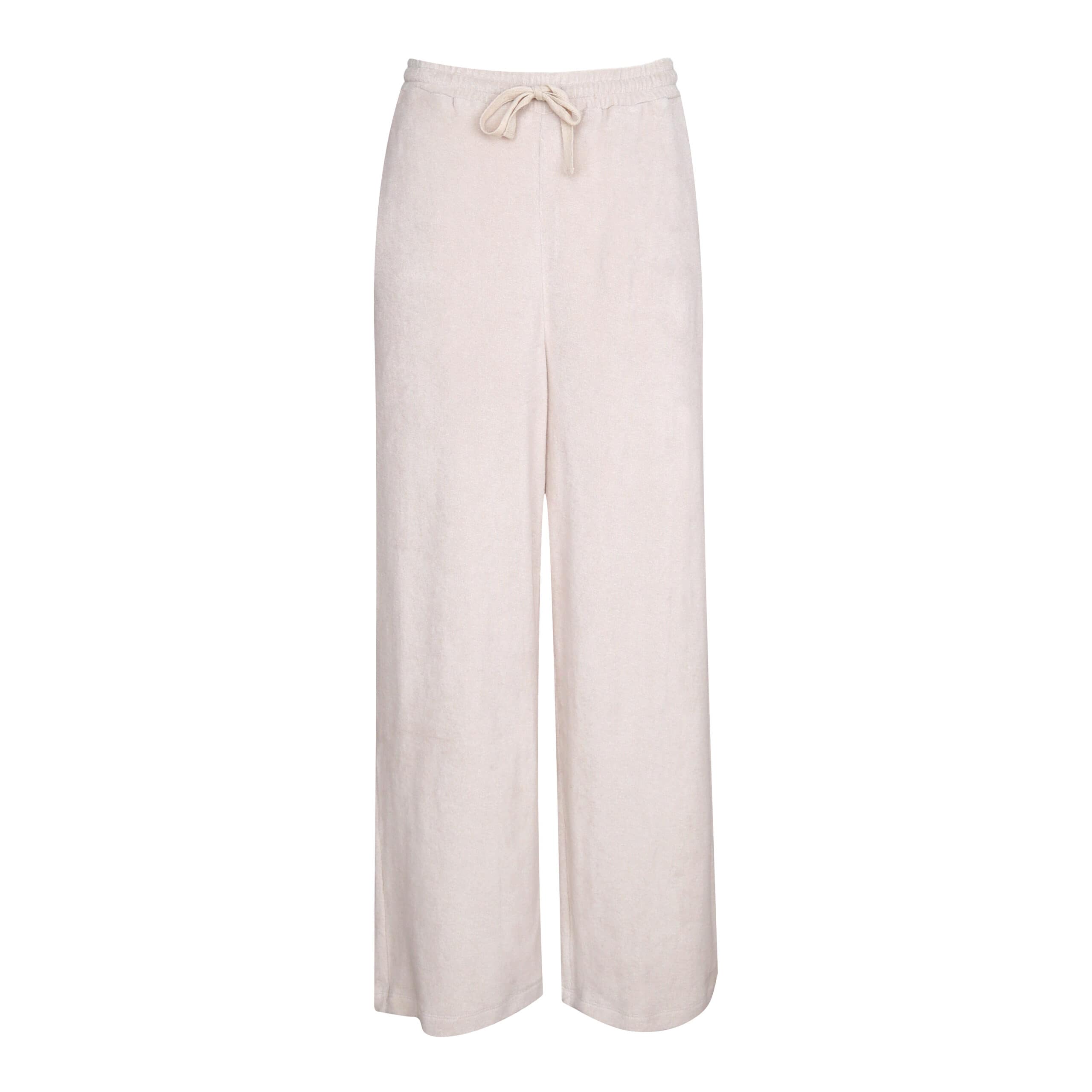 Wijde badstoffen pantalon van Bongusta, model Naram pants in moon beam. Deze beige broek is gemaakt van biologisch katoen, heeft een hoge taille en lange, rechte, wijde broekspijpen. De broek heeft een elastische taille, trekkoord, steekzakken en een achterzak.