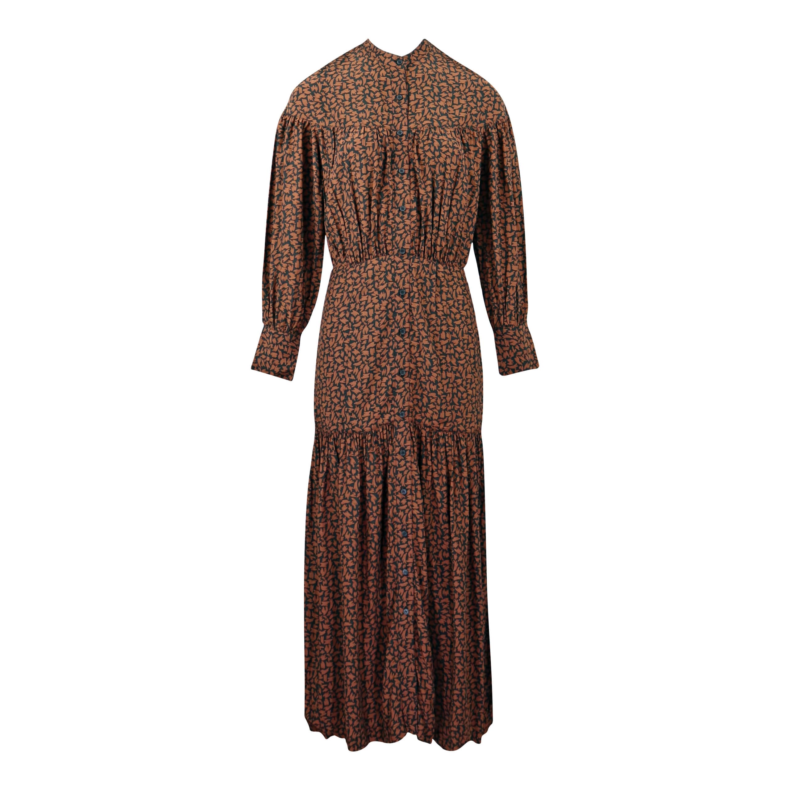 Maxi kleedje van By Malene Birger, model Reibe. Deze jurk is gemaakt van een zwarte stof met bruin motief die afwisseld geplooid is en heeft aan de voorzijde knoopjes. De jurk sluit met een verborgen ritssluiting aan de zijkant en met de knoopjes aan de voorzijde, heeft lange mouwen, een verhoogde licht elastische taille en hoge hals.