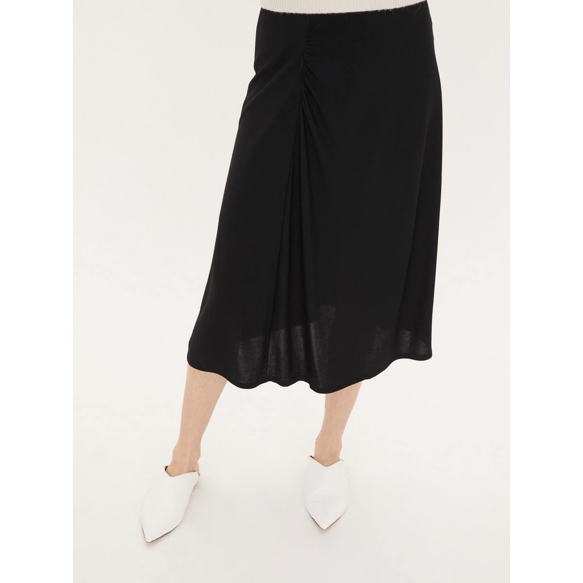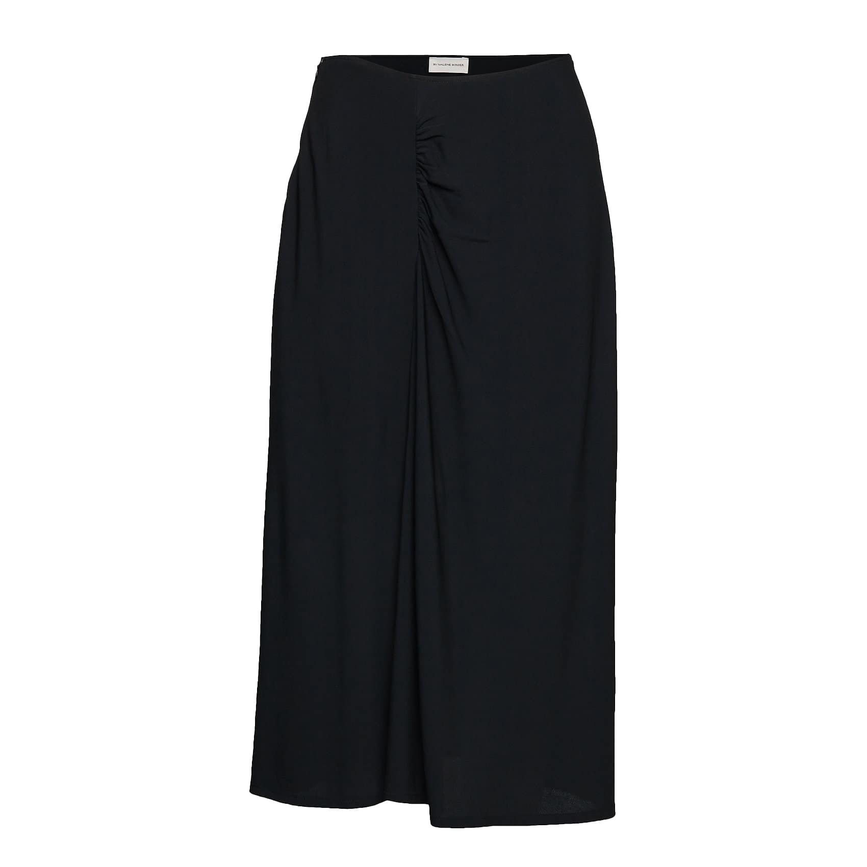Midi rok van By Malene Birger, model Luisia. Deze losvallende rok valt tot boven de enkels en sluit met een verborgen ritssluiting aan de zijkant. Aan de voorzijde heeft de rok een sierlijke naad, waardoor de rok in losse plooien valt met een asymmetrische zoom.