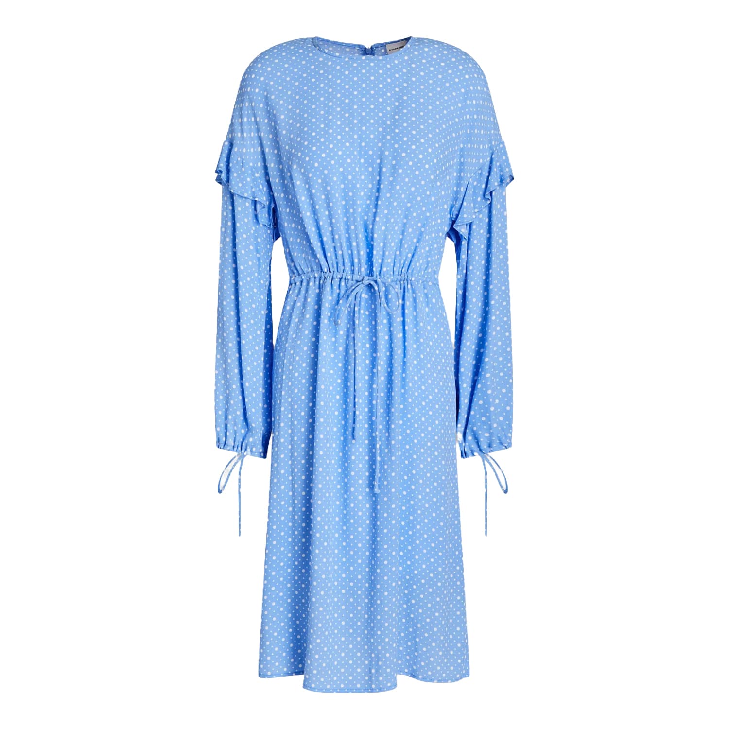 Lichtblauw kleedje van By Malene Birger, model Anamaria. Deze jurk is gemaakt van een lichtblauwe stof met witte polka-dots, valt net boven de knie en heeft een verhoogde taille met trekkoord. De jurk heeft een losvallende pasvorm, bij de schouders ruches en sluit met een verborgen ritssluiting aan de achterzijde.