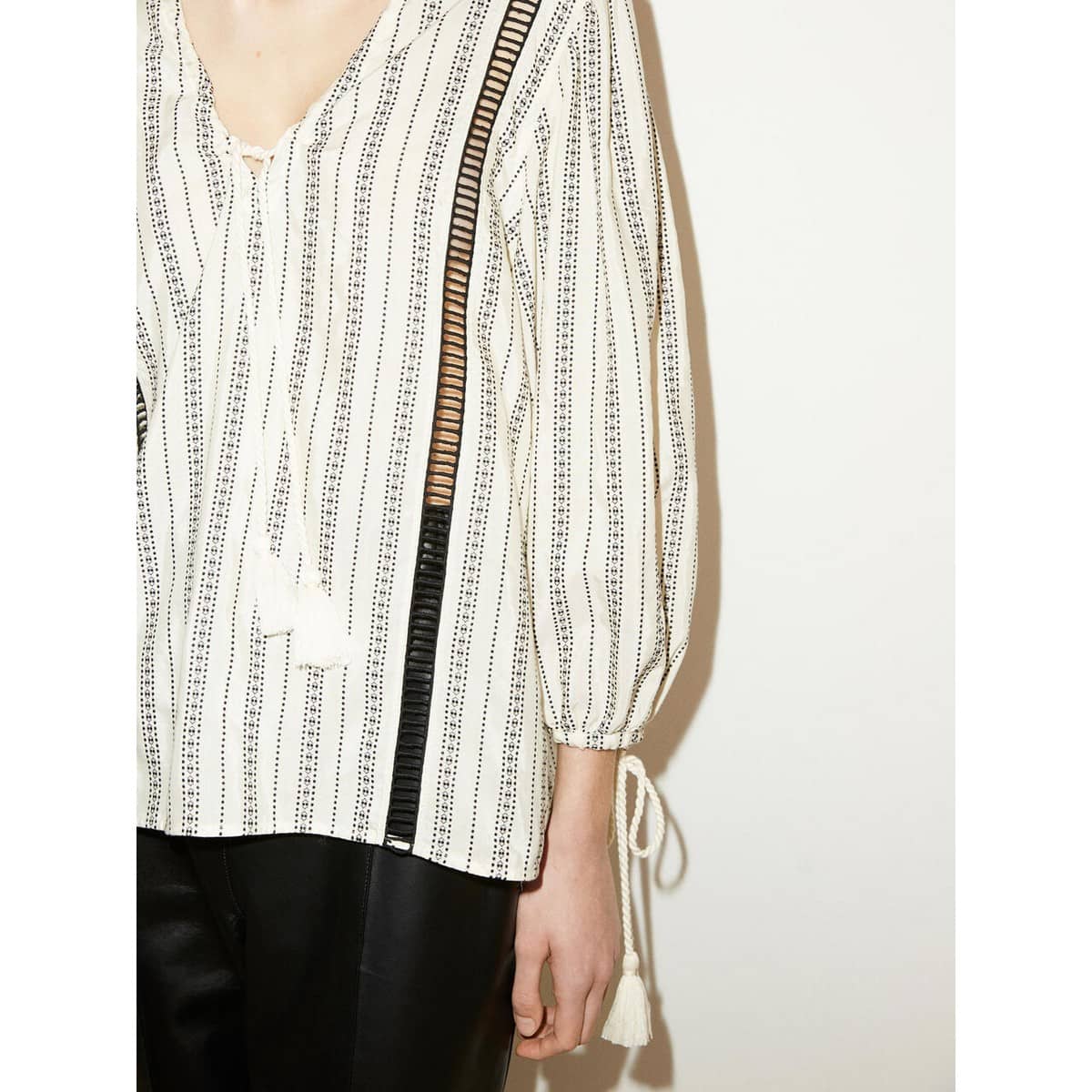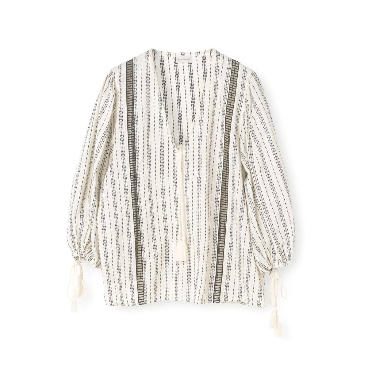 Relaxte tuniek van By Malene Birger, model Figne. Deze gestreepte tuniek heeft een ruimvallende pasvorm met een opengewerkte lijn en kwastjes. Deze kwastjes komen ook weer terug aan de manchetten van de pofmouwen.