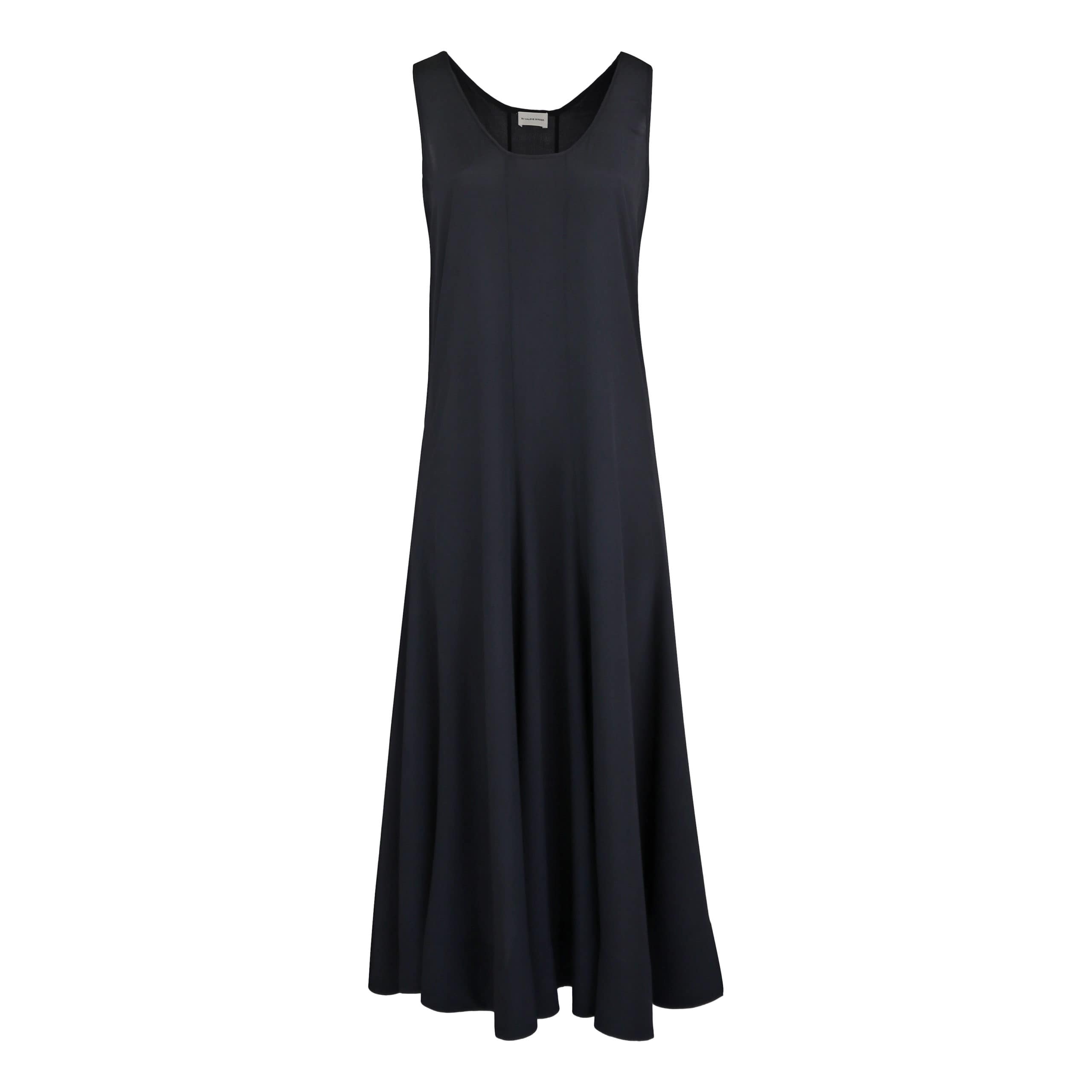 Zwart midi kleedje van By Malene Birger. Deze jurk is gemaakt van een dunne zwarte stof en heeft een uitlopende pasvorm. De jurk is belijnd en mouwloos.