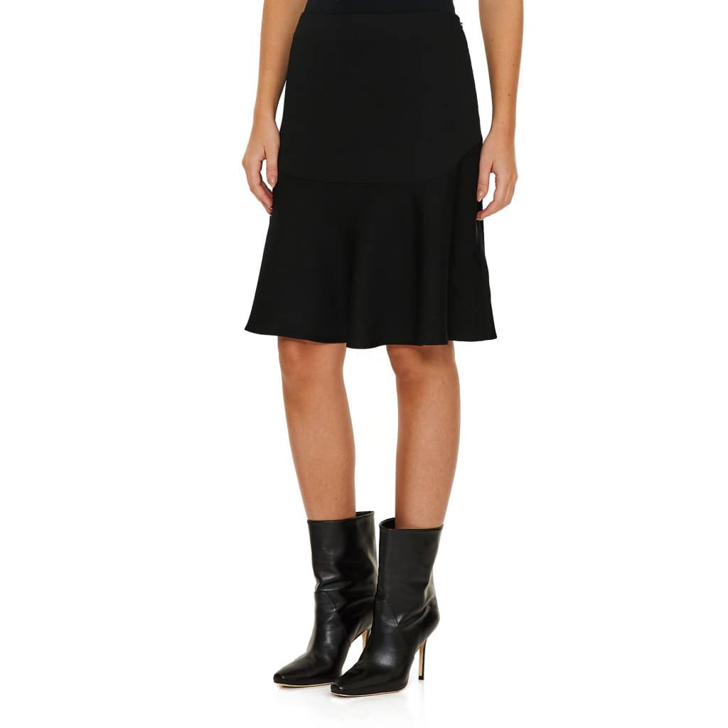 Korte zwierige rok van By Malene Birger, model Leela. Deze losvallende rok valt boven de knie en sluit met een verborgen ritssluiting aan de zijkant. De rok heeft halverwege een maanvormige naad lopen, waarna de rok wijd uitloopt.