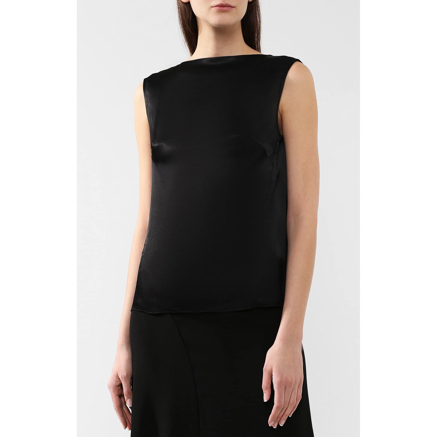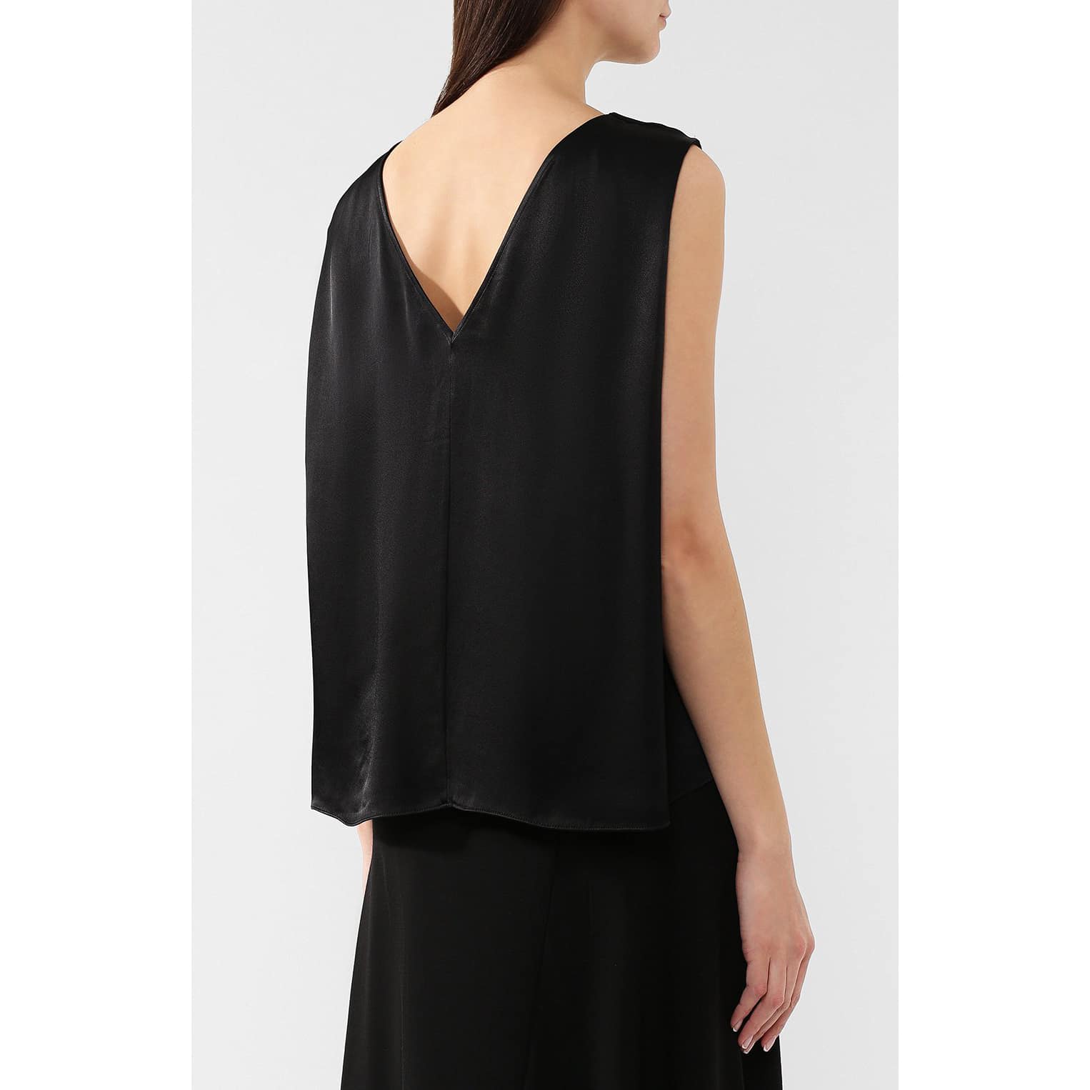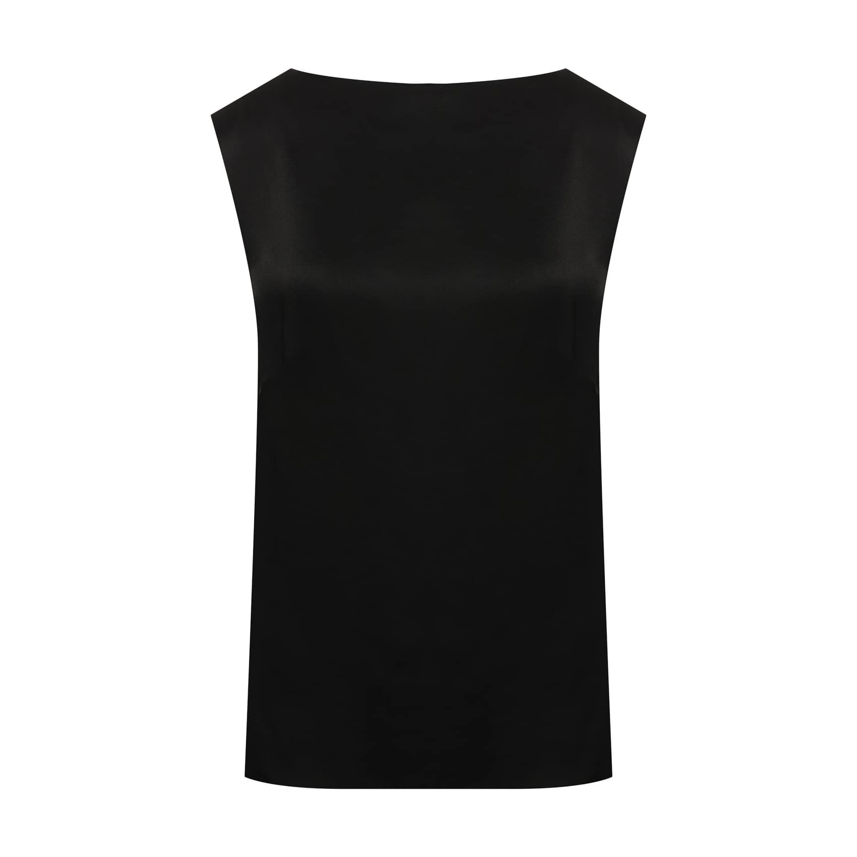Zwarte satijnen top van By Malene Birger. Deze top is gemaakt van een satijnen stof en heeft een oversized pasvorm. De top heeft aan de voorzijde een ronde hals met aan de achterzijde een V insnede.