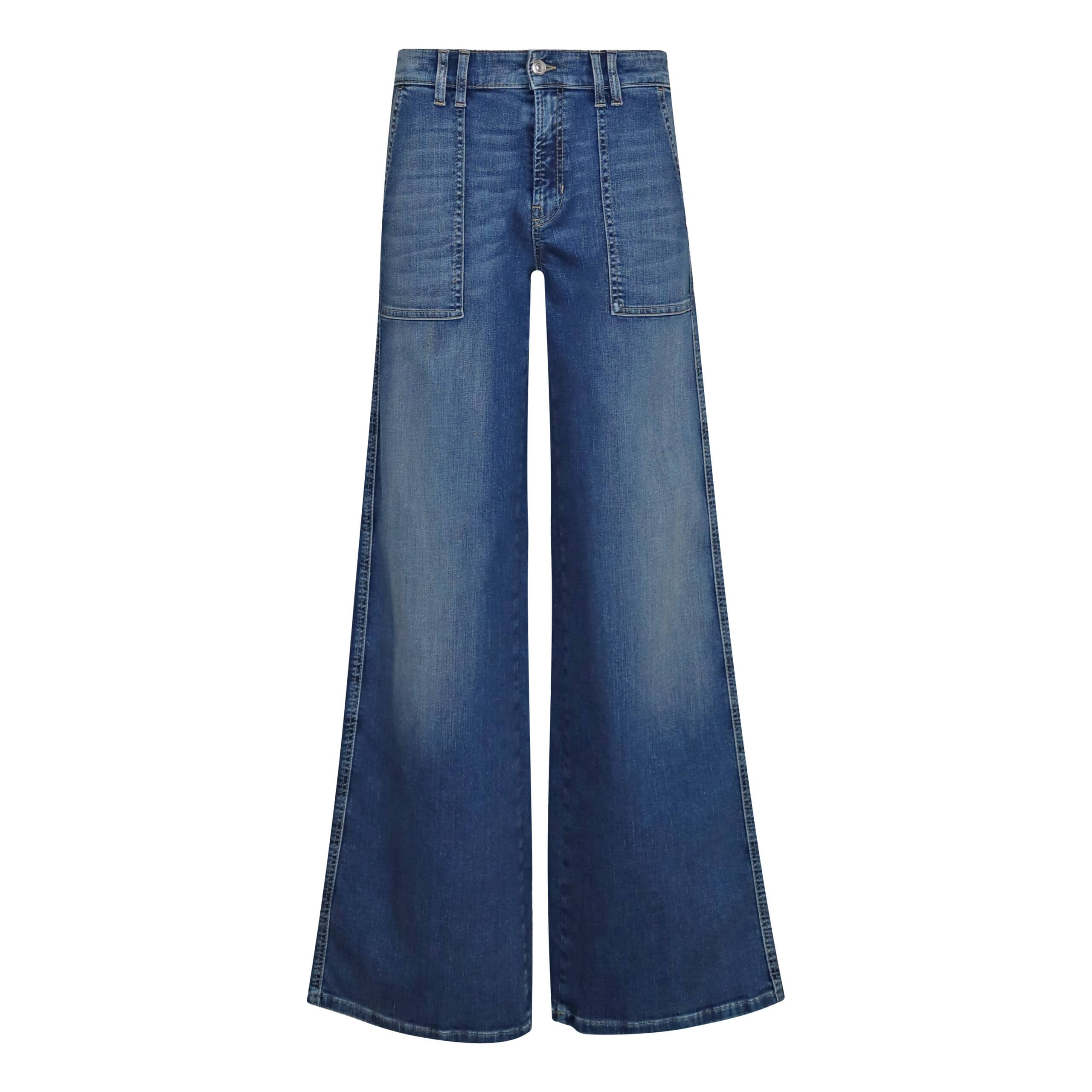 Blauwe jeans van Cambio, model Alek in mid contrast used. Deze spijkerbroek is gemaakt van blauwe stretch denim, heeft een loose fit pasvorm met wijde broekspijpen en een hoge taille. De jeans sluit met een knoop- en ritssluiting, heeft twee rechte steekzakken en twee achterzakken.