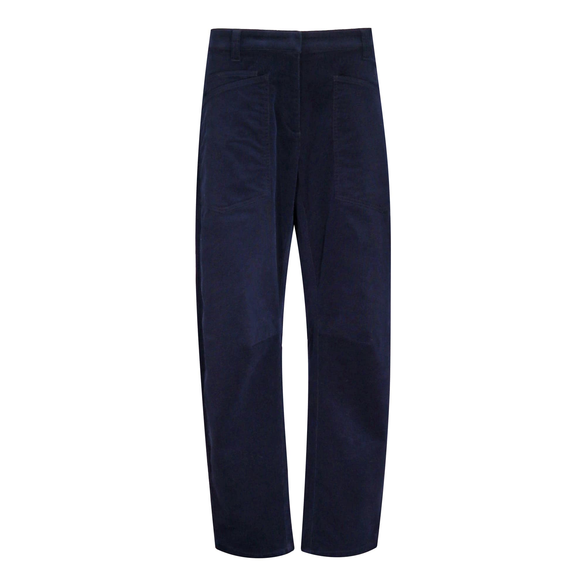 Ribfluwelen pantalon van Cambio, model Ocean. Deze broek is gemaakt van een fijne, donkerblauwe ribfluwelen stretch stof en heeft een baggy pasvorm. De broek sluit met een haakje, knoop- en ritssluiting, heeft twee diepe steekzakken, twee achterzakken en wijde broekspijpen.
