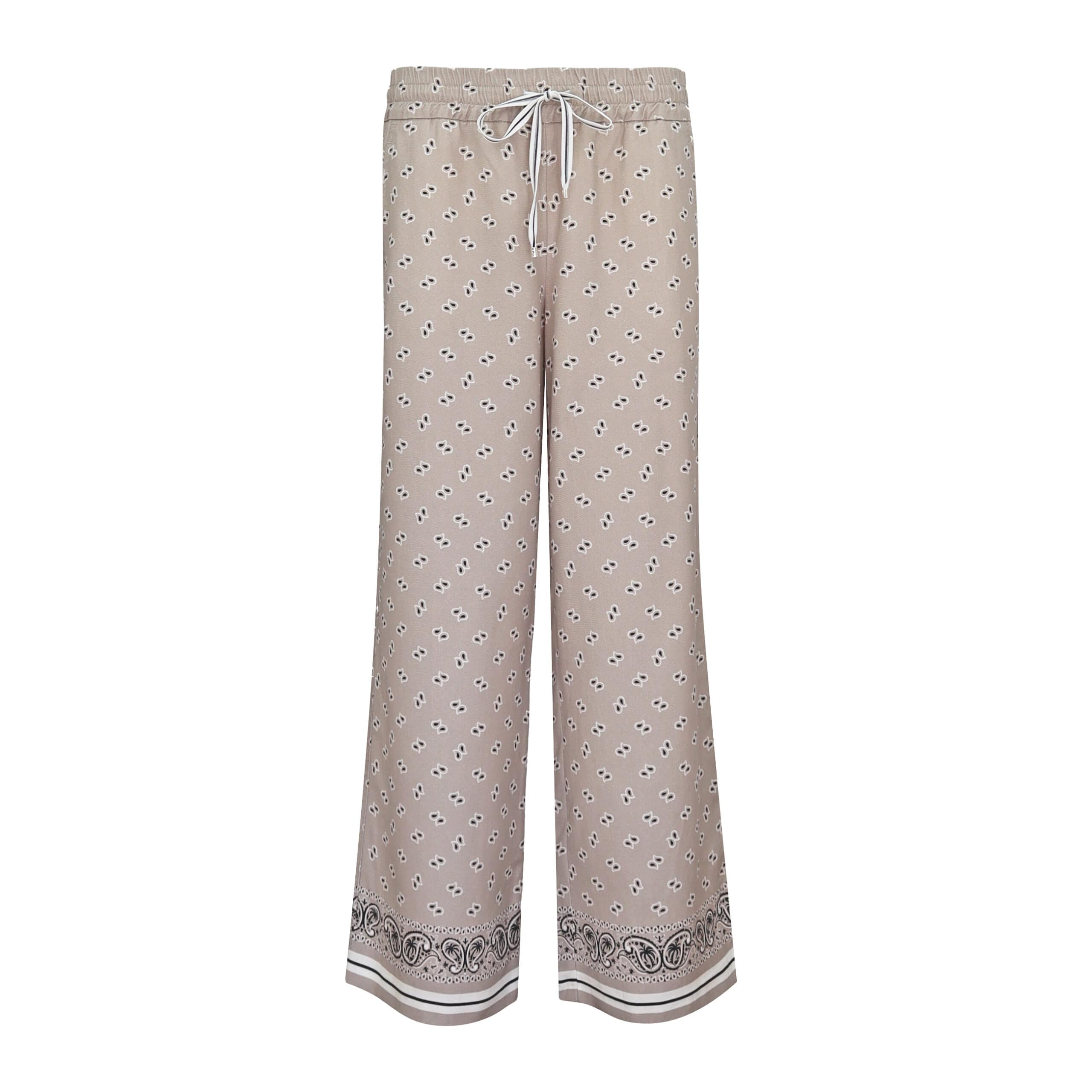 Beige pantalon van Cambio. Deze relaxte broek is gemaakt van lyocell, heeft een beige basis met een zwart en wit motief en rechte, wijde broekspijpen. De broek heeft een elastische tailleband met trekkoord, twee steekzakken en sier paspelzakjes.