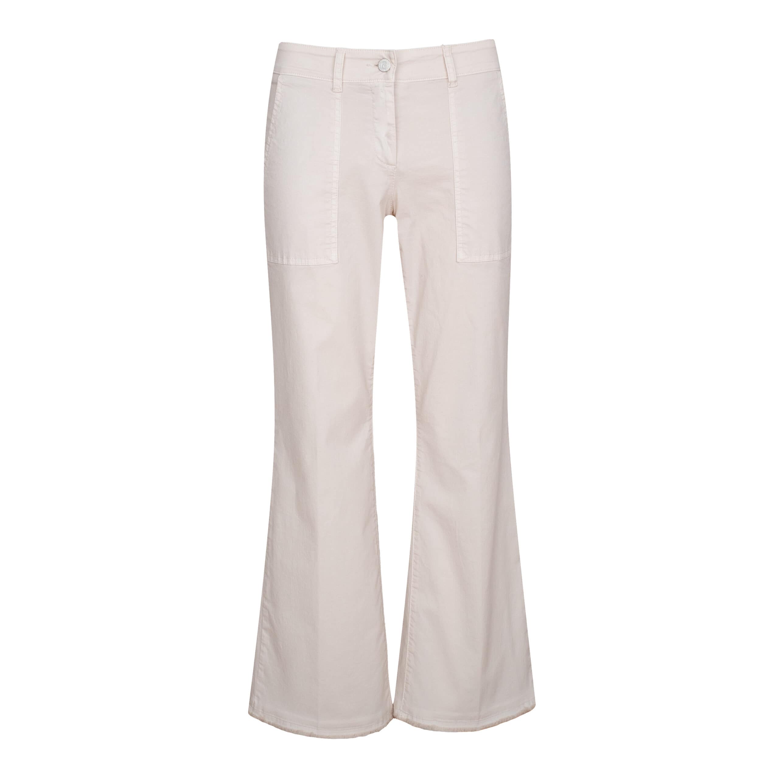 Beige pantalon pantalon van Cambio. Deze broek is gemaakt van beige stretch katoen en heeft flared broekspijpen met aan de onderzijde fijne rafels. De pantalon sluit met een knoop- en ritssluiting, twee steekzakken en twee achterzakken.