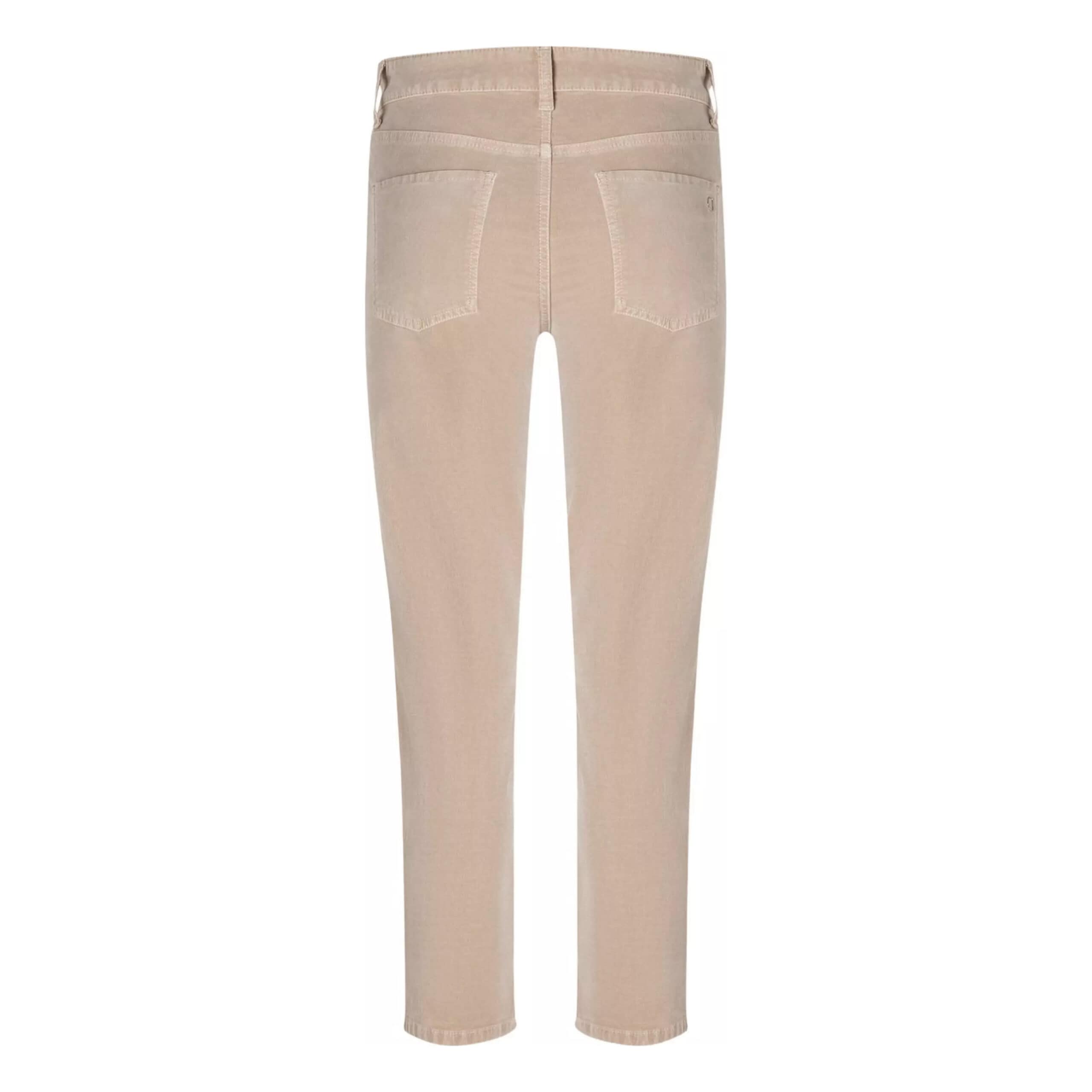 Beige fluwelen broek van Cambio, model Piper Cropped. Deze broek is gemaakt van een fluwelen stretch stof en heeft een slim fit pasvorm met een normale taille. De velvet broek sluit met een knoop- en ritssluiting en valt tot net boven de enkels.