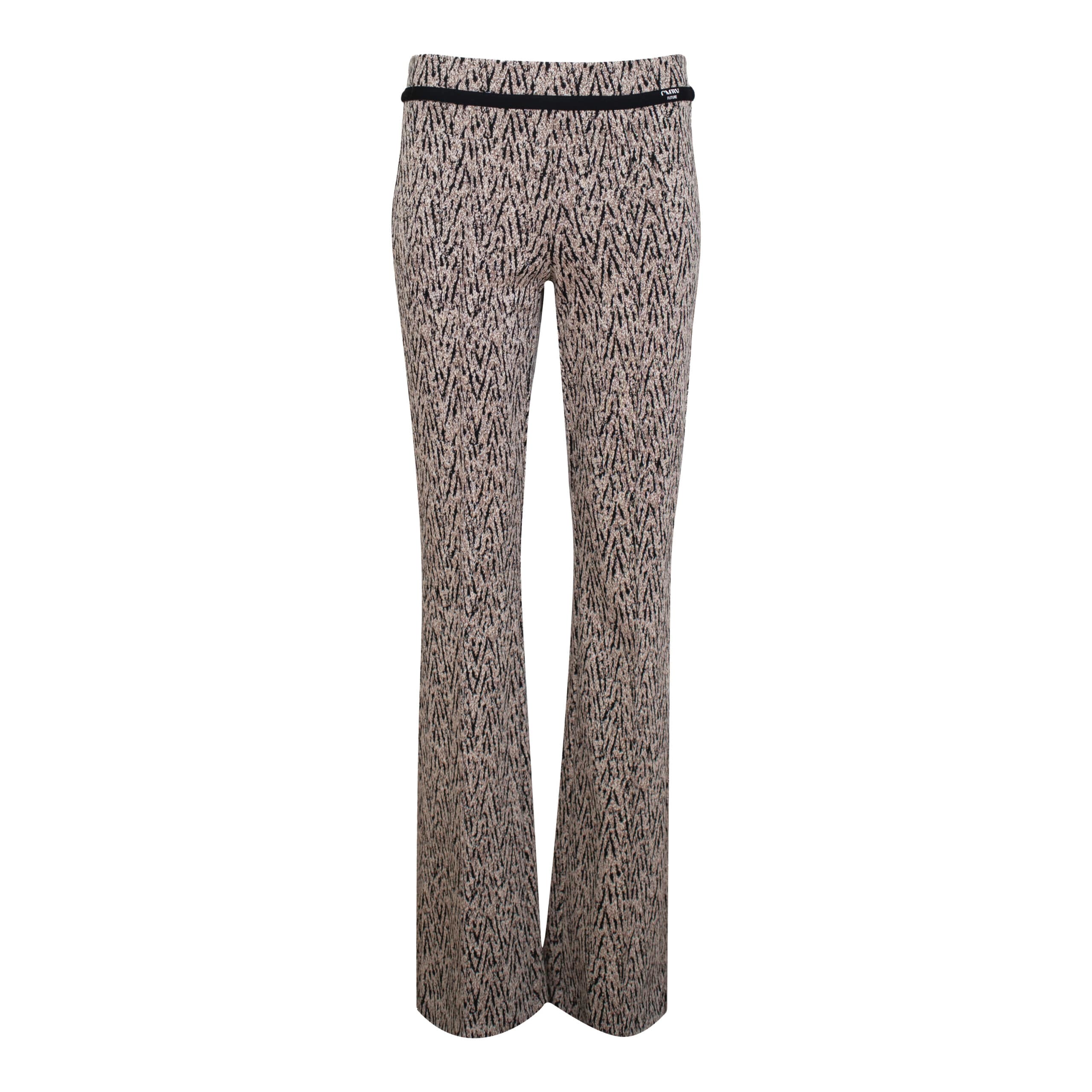 Slim fit flared broek van Cambio. Deze relaxte broek is gemaakt van een jersey stretch stof met een beige met wit en zwart motief. De broek heeft een elastische tailleband en flared broekspijpen.