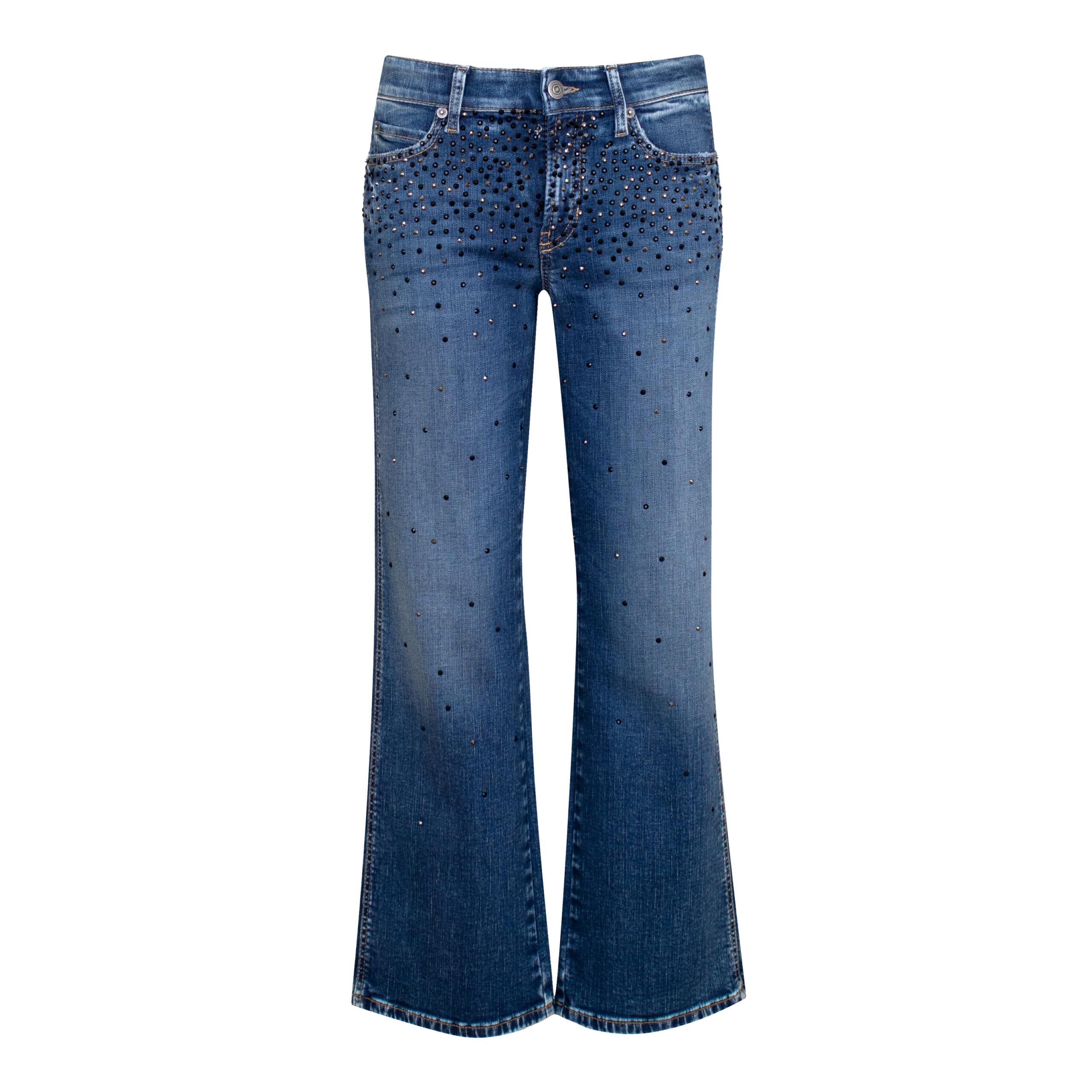Blauwe jeans van Cambio, model Francesca in cozy used. Deze broek is gemaakt van blauwe stretch denim, heeft een slim fit pasvorm met licht uitlopende broekspijpen en is versiert met decoratieve steentjes. De broek sluit met een knoop- en ritssluiting, heeft twee steekzakken en twee achterzakken.