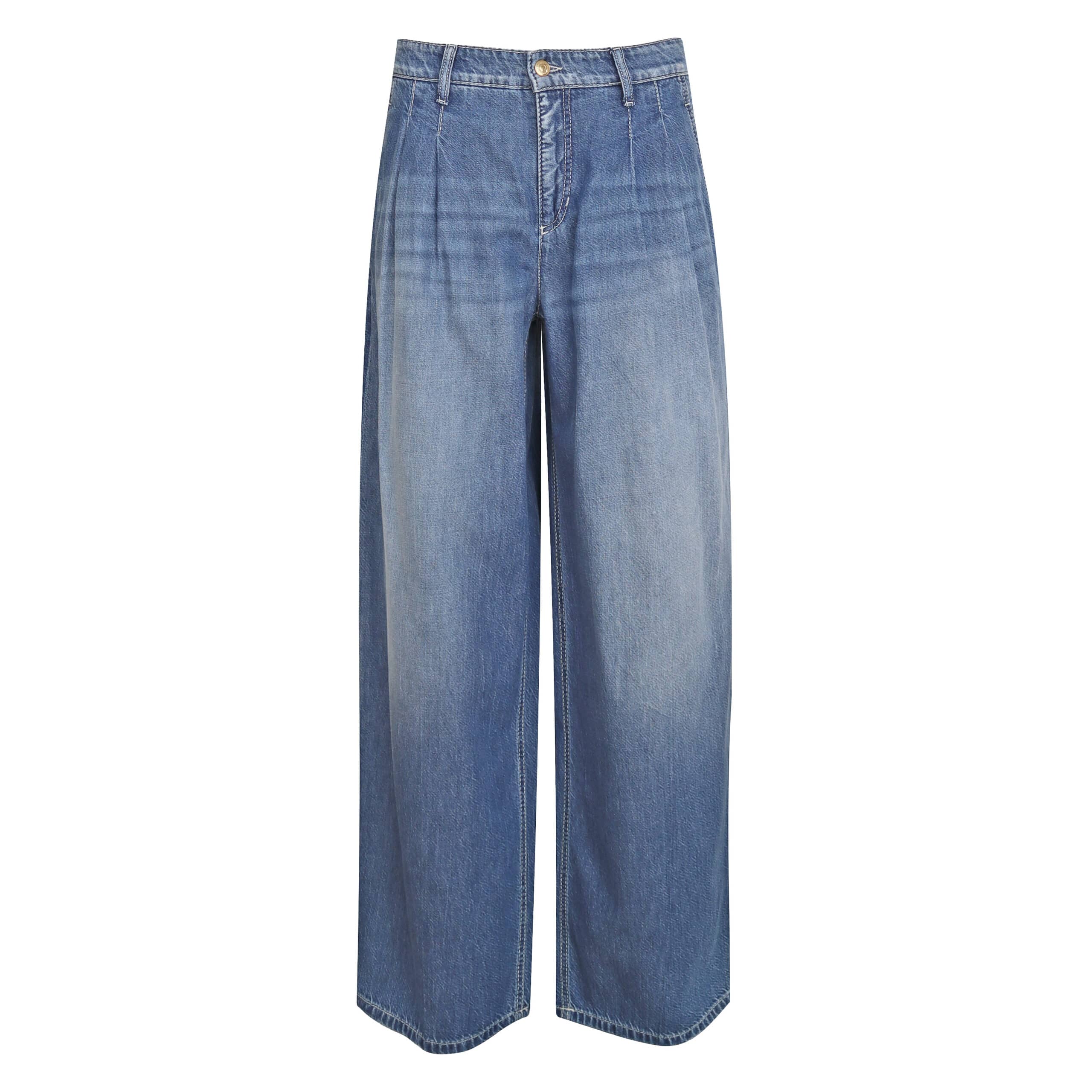 Blauwe jeans van Cambio, model Alma in drapy authentic used. Deze spijkerbroek is gemaakt van een blauwe denim, heeft een loose fit pasvorm met wijde broekspijpen en een geplooide tailleband. De jeans sluit met een knoop- en ritssluiting, heeft twee steekzakken en twee achterzakken.
