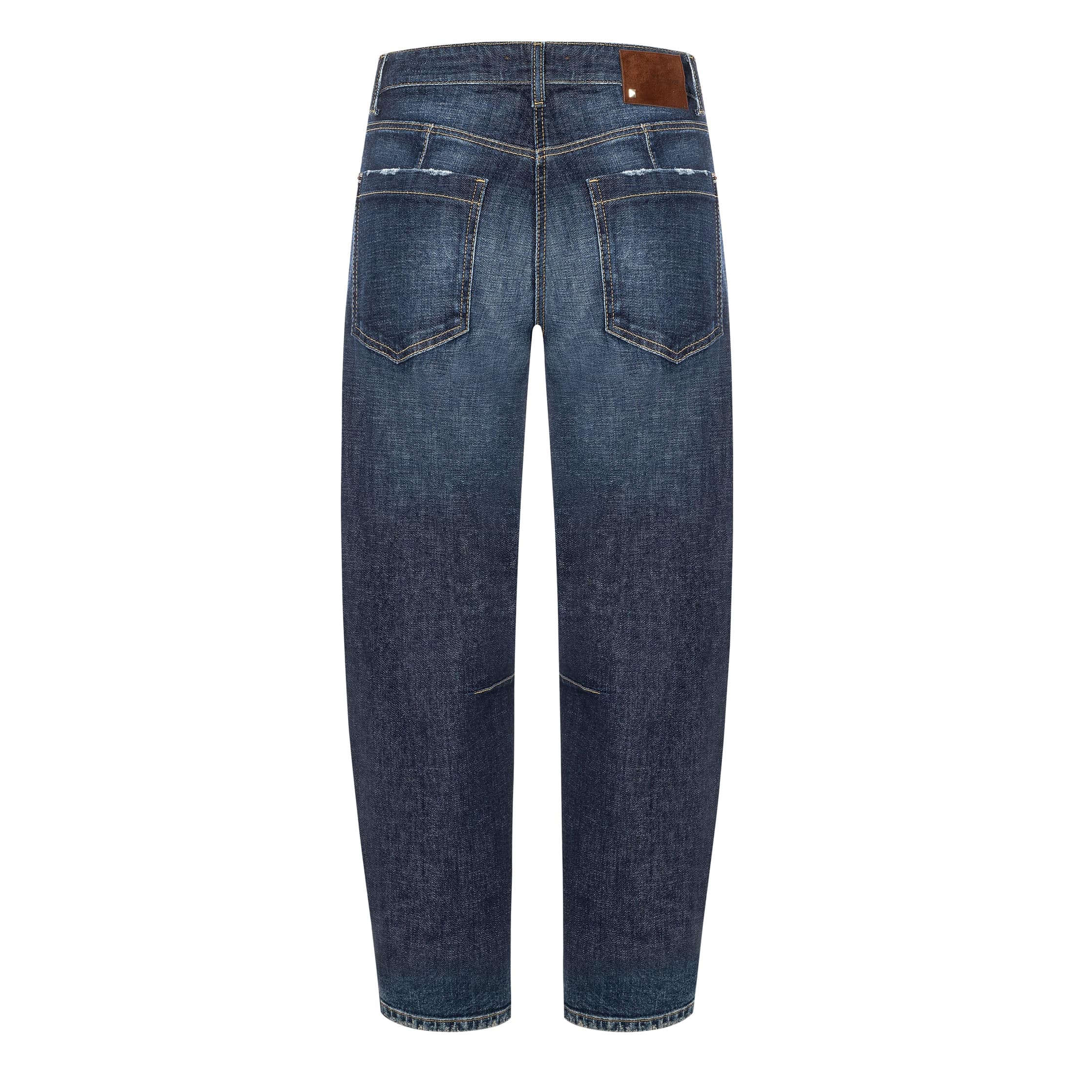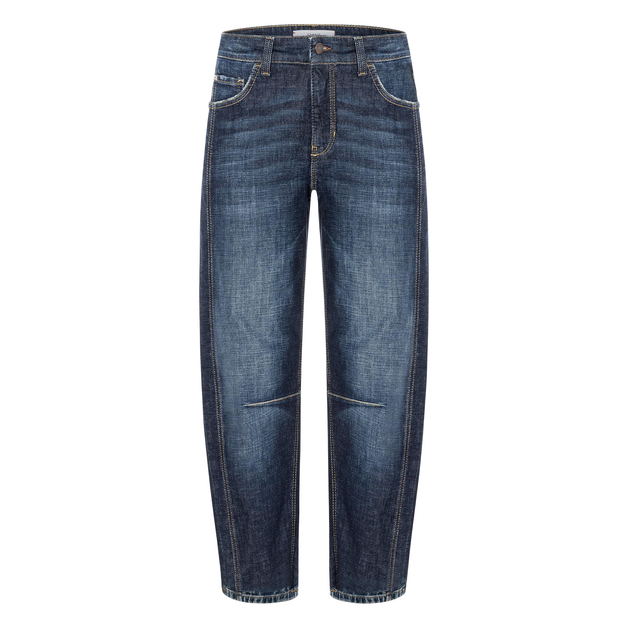 Blauwe jeans van Cambio, model Elia in blue cross used. Deze broek is gemaakt van een denim stretch stof, heeft barrel legs en een hogere taille. De pantalon sluit met een knoop- en ritssluiting, heeft twee steekzakken en twee achterzakken.