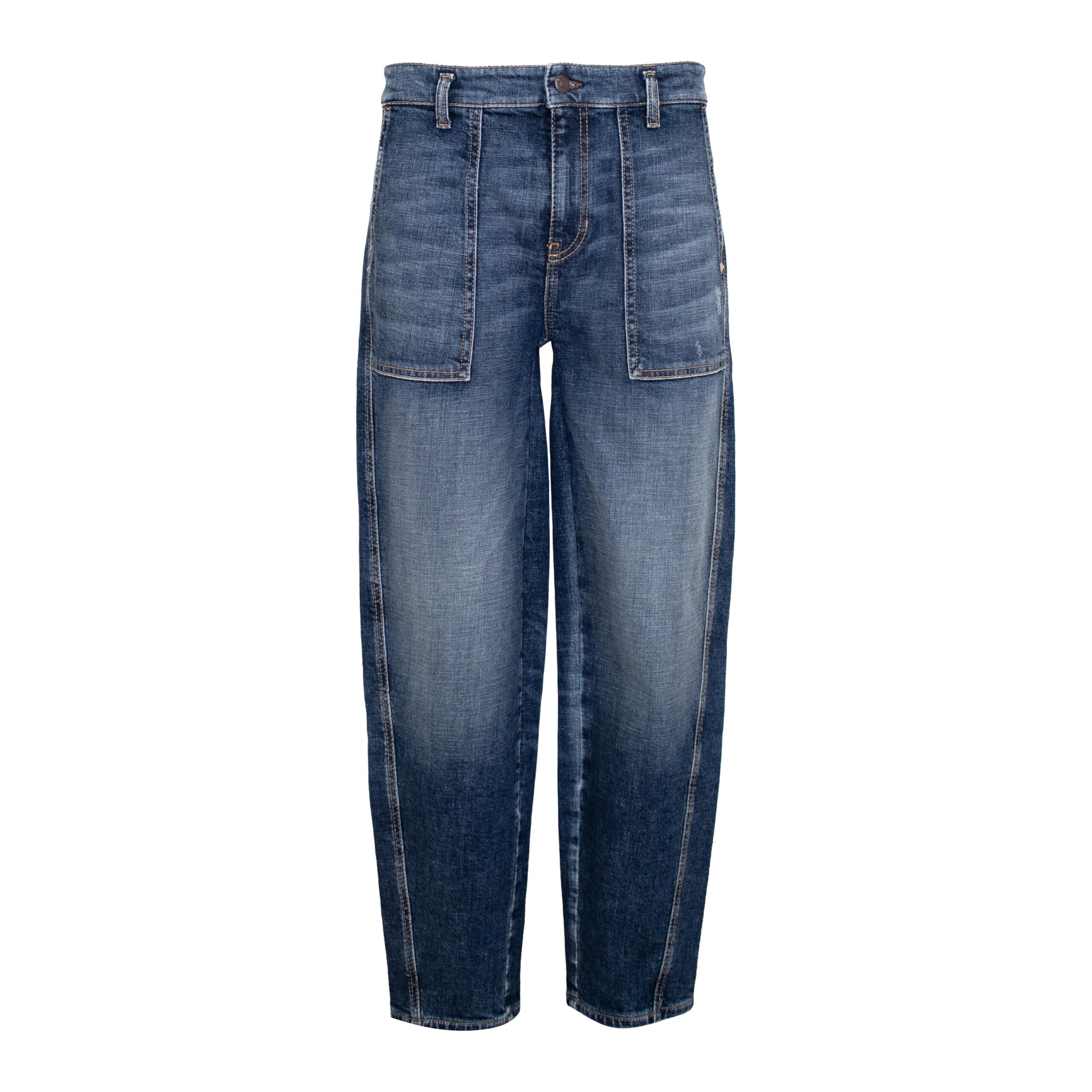Blauwe jeans van Cambio, model Odeta in dark cross. Deze spijkerbroek is gemaakt van blauwe stretch denim met een used wassing, heeft een barrel fit en een hoge taille. De broek sluit met een knoop- en ritssluiting, heeft twee grote steekzakken en twee achterzakken.