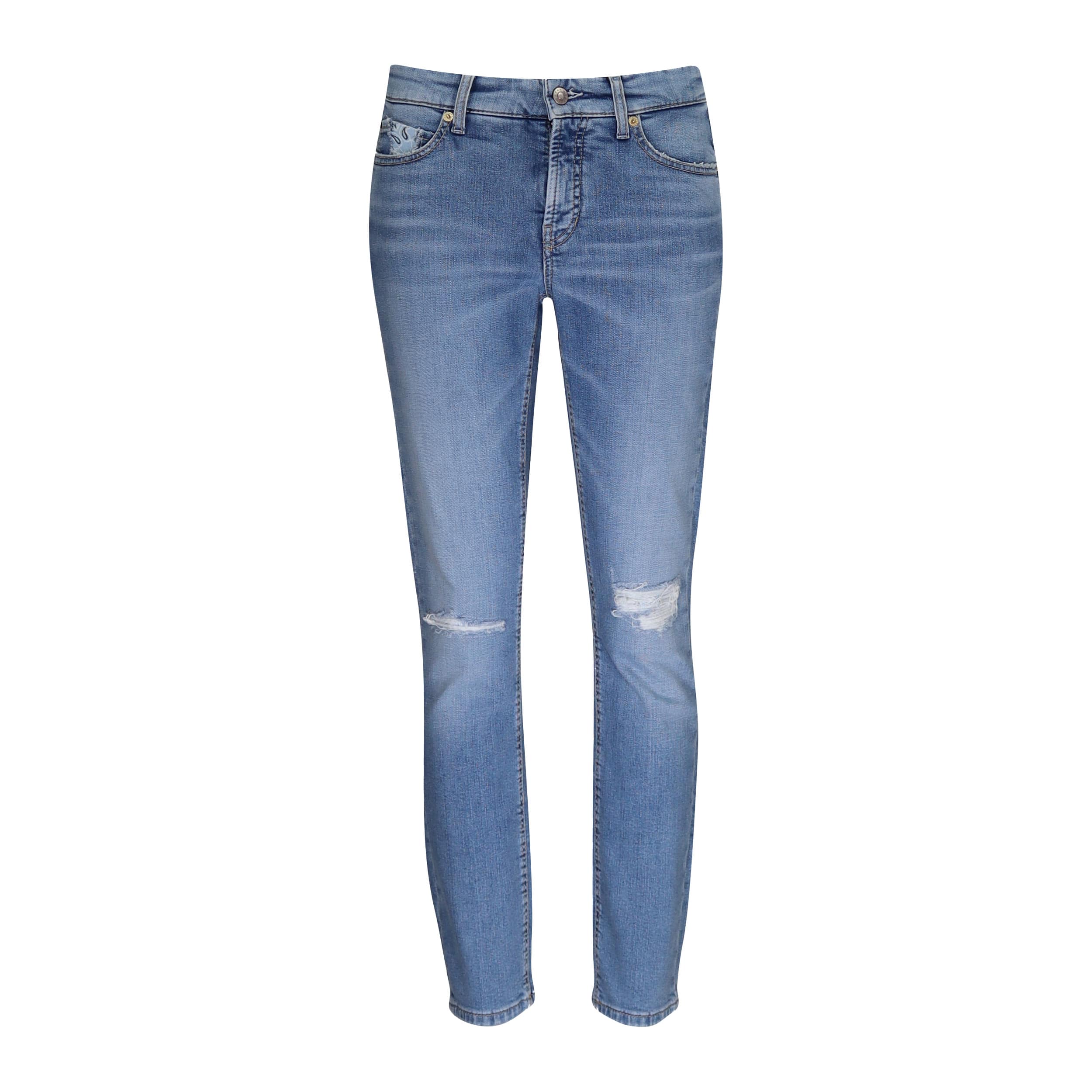 Slim fit jeans van Cambio, model Paris Cropped. Deze broek is gemaakt van blauwe denim stretch stof en heeft beschadigingen aan de knieën en achterzakken. De jeans sluit met een knoop- en ritssluiting, heeft twee steekzakken en twee achterzakken.