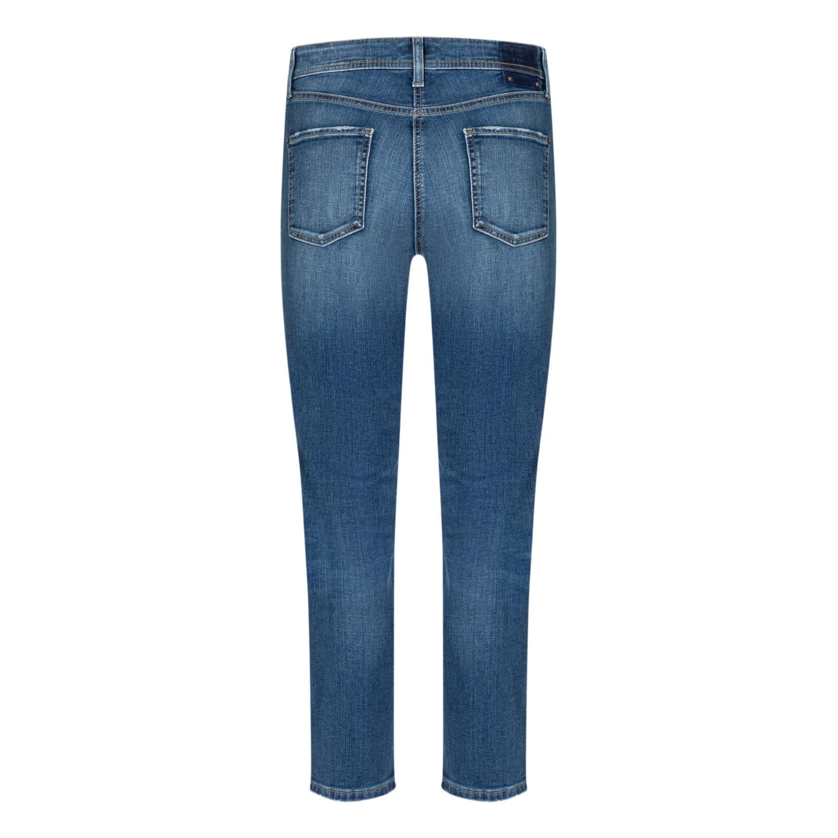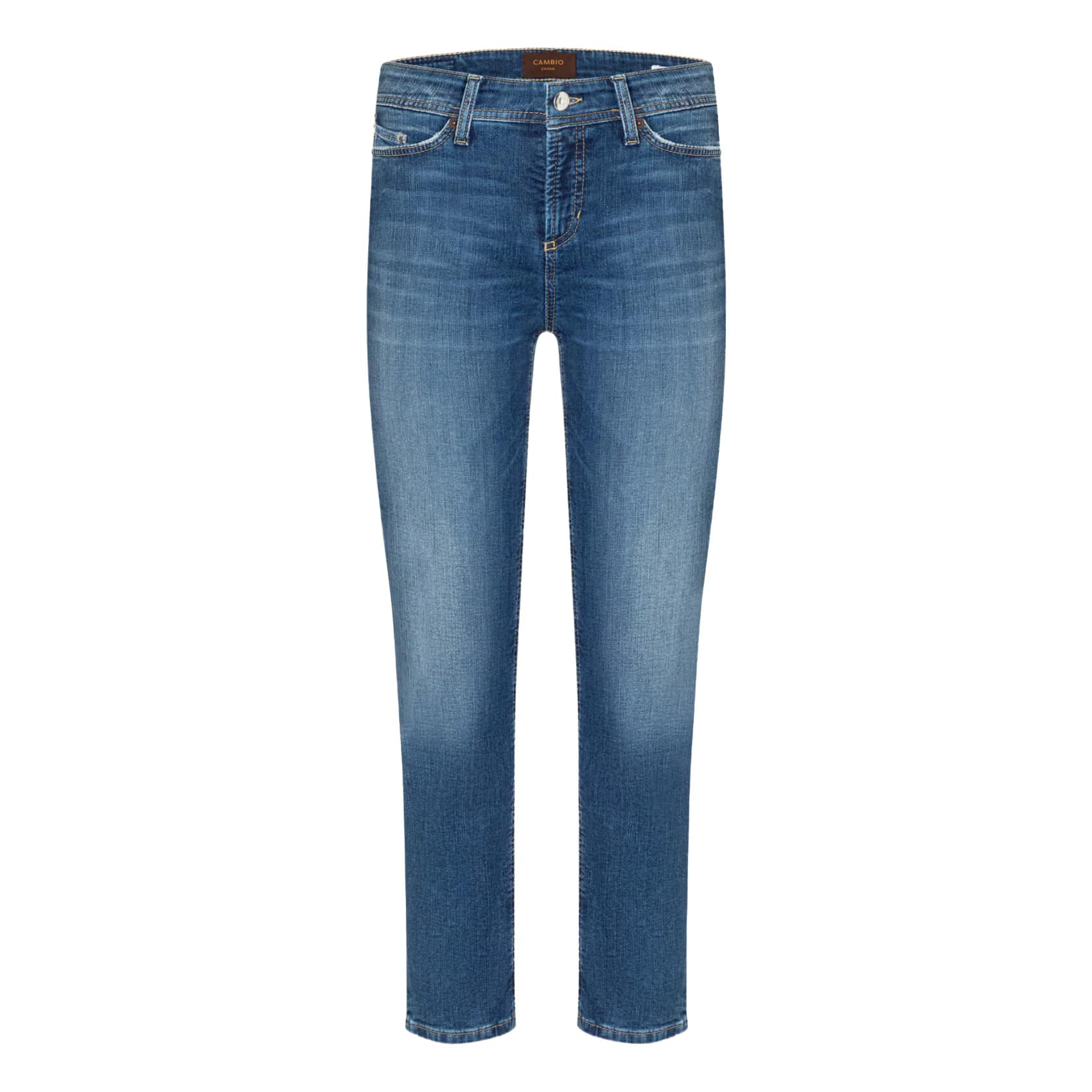 Blauwe jeans van Cambio, model Piper Cropped in mid used. Deze broek is gemaakt van een denim stretch stof en heeft een slim fit pasvorm met een normale taille. De jeans sluit met een knoop- en ritssluiting, heeft twee steekzakken en twee achterzakken.
