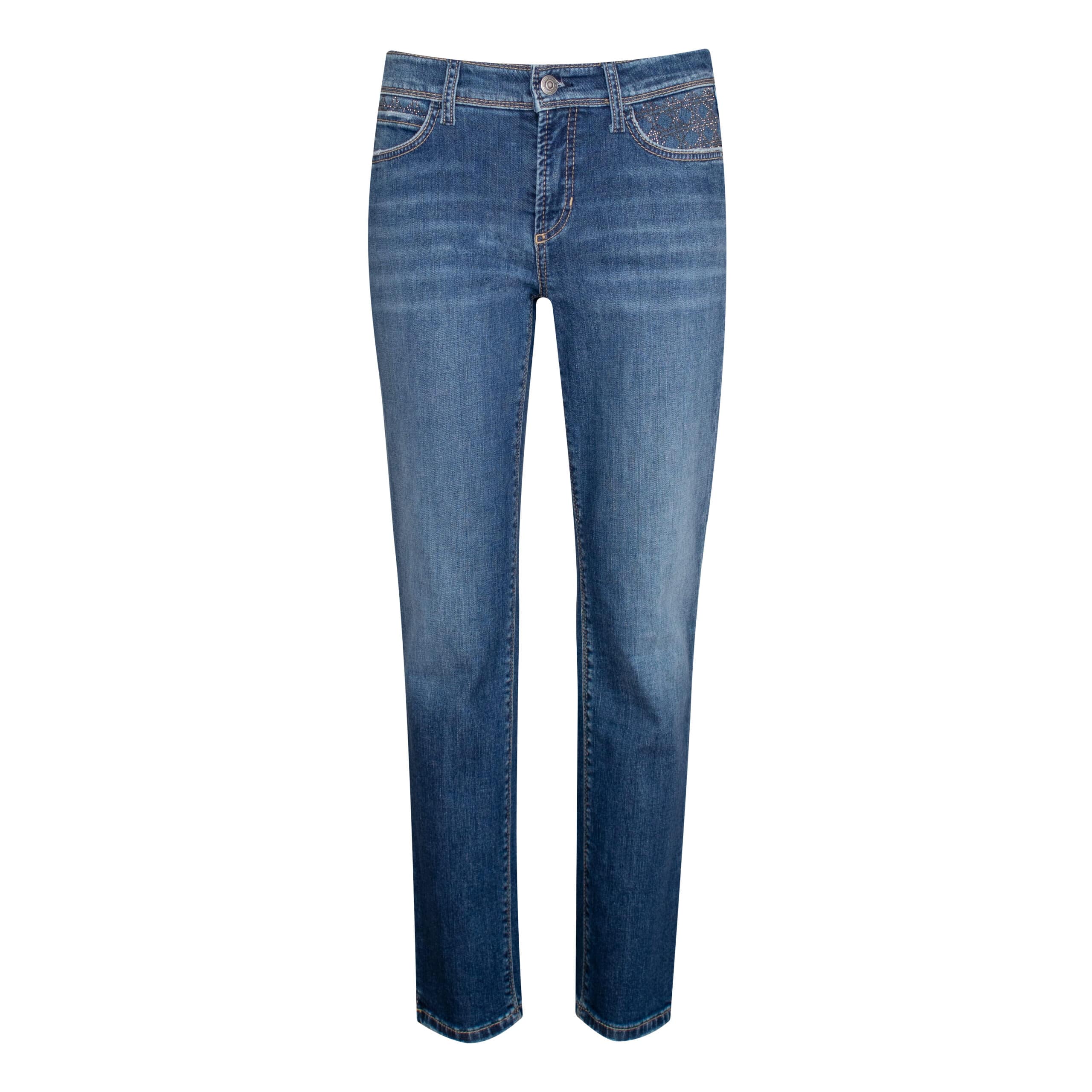 Blauwe jeans van Cambio, model Piper Short in sophisticated decent used. Deze spijkerbroek is gemaakt van stretch denim en heeft een slim fit pasvorm met een normale taille. De jeans sluit met een knoop- en ritssluiting, heeft twee steekzakken met strass en twee achterzakken.