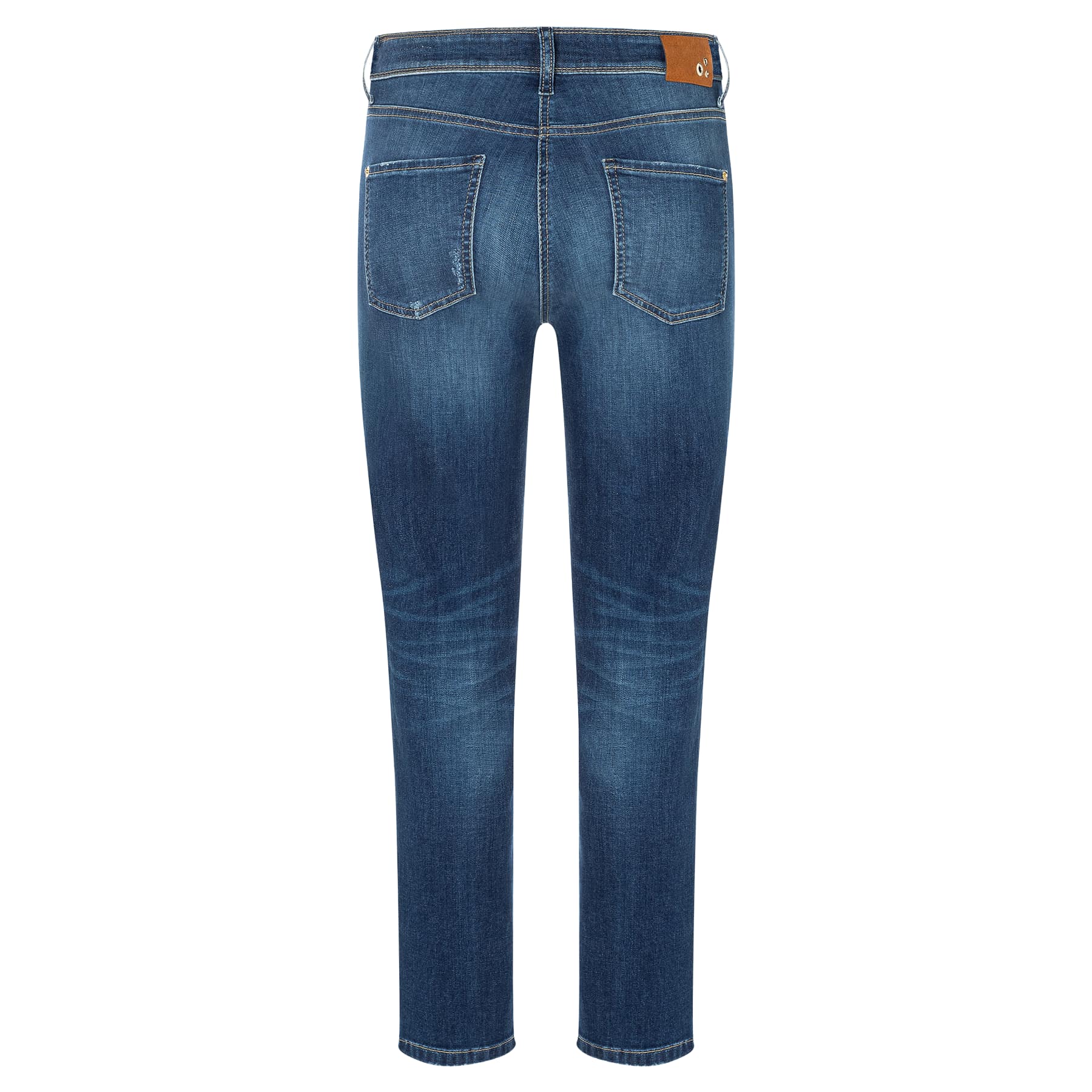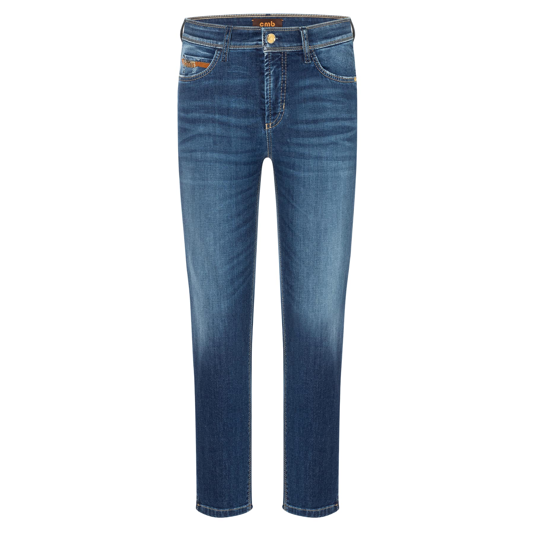 Blauwe jeans van Cambio, model Piper Short in feminin lifely used. Deze spijkerbroek is gemaakt van stretch denim en heeft een slim fit pasvorm met een normale taille. De jeans sluit met een knoop- en ritssluiting, heeft twee steekzakken, twee achterzakken en een muntzakje met de letters CMB.