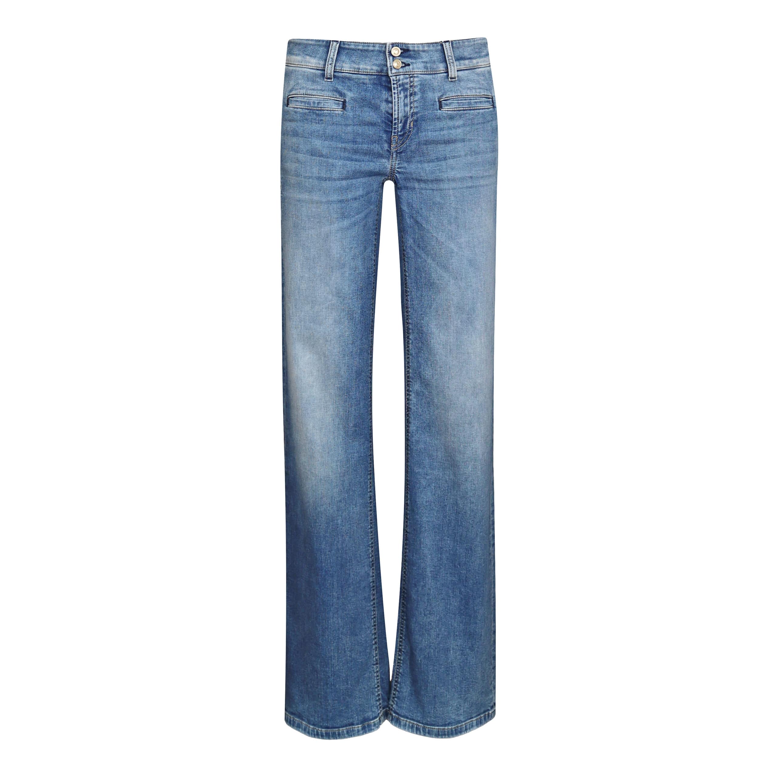 Blauwe jeans van Cambio in sunny feminine used. Deze broek is gemaakt van blauwe stretch denim en heeft een rechte pasvorm met licht uitlopende broekspijpen. De broek sluit met een knoop- en ritssluiting, heeft twee steekzakken en twee achterzakken.
