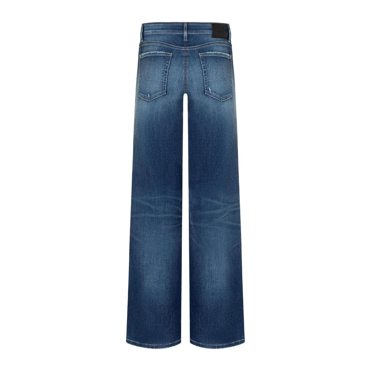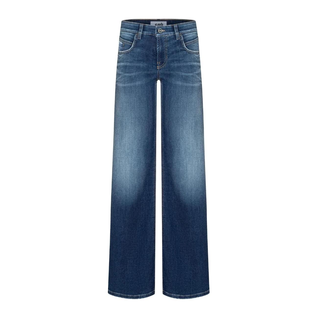 Blauwe jeans van Cambio, model Tess in authentic modern used. Deze broek is gemaakt van een denim stretch stof en heeft wijde, rechte broekspijpen. De jeans sluit met een knoop- en ritssluiting, heeft twee steekzakken en twee achterzakken.