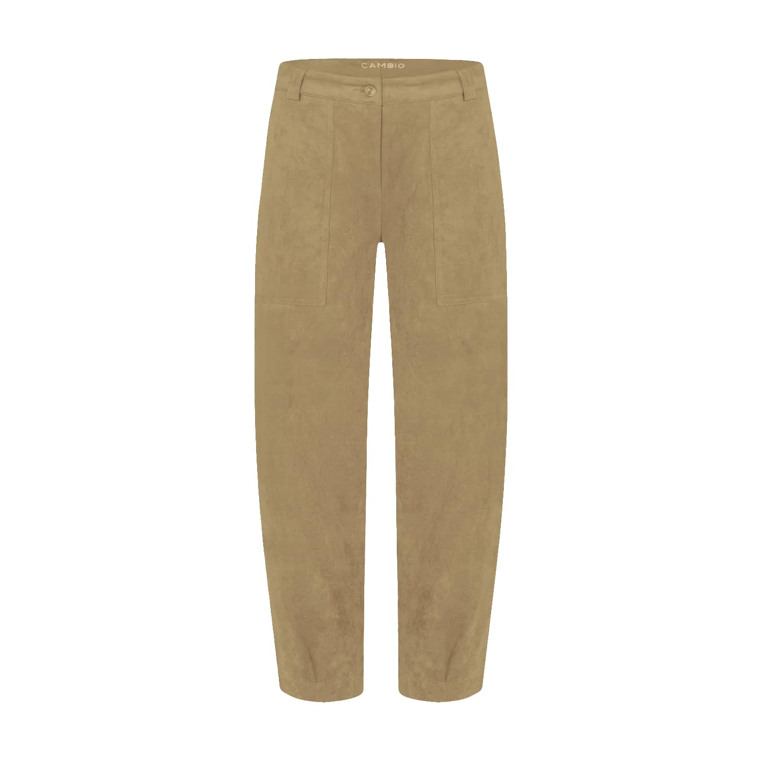 Bruine suède look pantalon van Cambio, model Kiss pleat. Deze broek is gemaakt van een lichtbruine stretch stof met een suède look en heeft een carrot fit. De pantalon sluit met een knoop- en ritssluiting, heeft twee steekzakken en twee paspelzakken.
