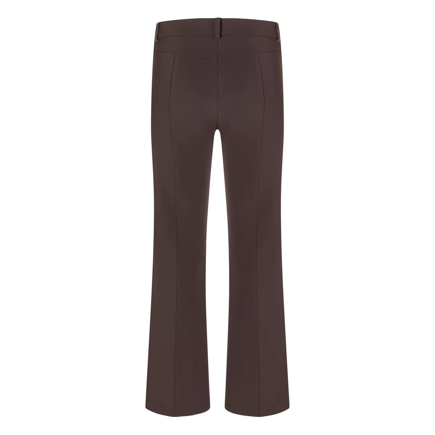 Bruine pantalon van Cambio, model Farah long. Deze broek is gemaakt van een gladde, bruine stretch stof en heeft rechte broekspijpen met een vaste naad die licht uitlopen. De broek sluit met haakjes, een knoop- en ritssluiting en twee steekzakken.