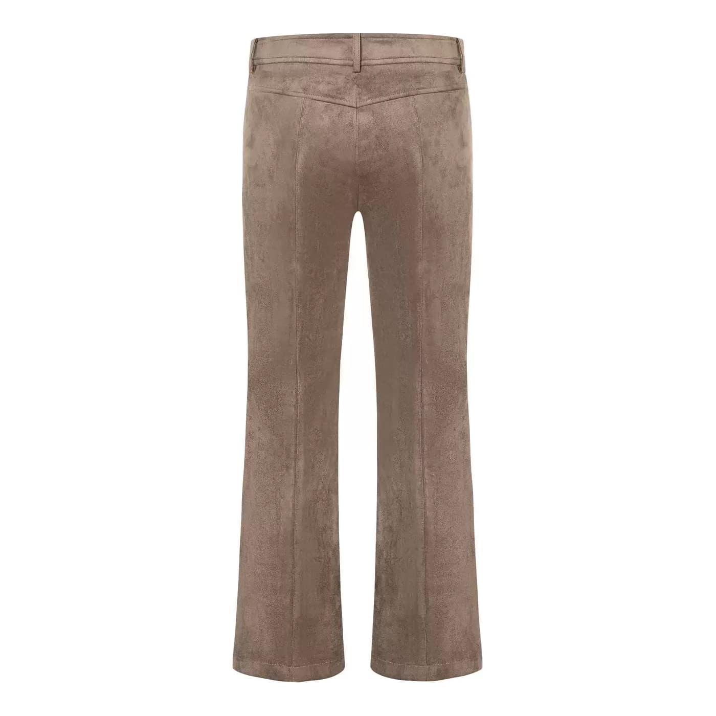 Bruine pantalon van Cambio, model Farah patched pocket in petit loop. Deze 7/8 broek is gemaakt van een suedelook stretch stof en heeft rechte broekspijpen met een vaste naad die licht uitlopen. De broek sluit met een knoop- en ritssluiting en heeft twee klepzakjes aan de voorzijde.