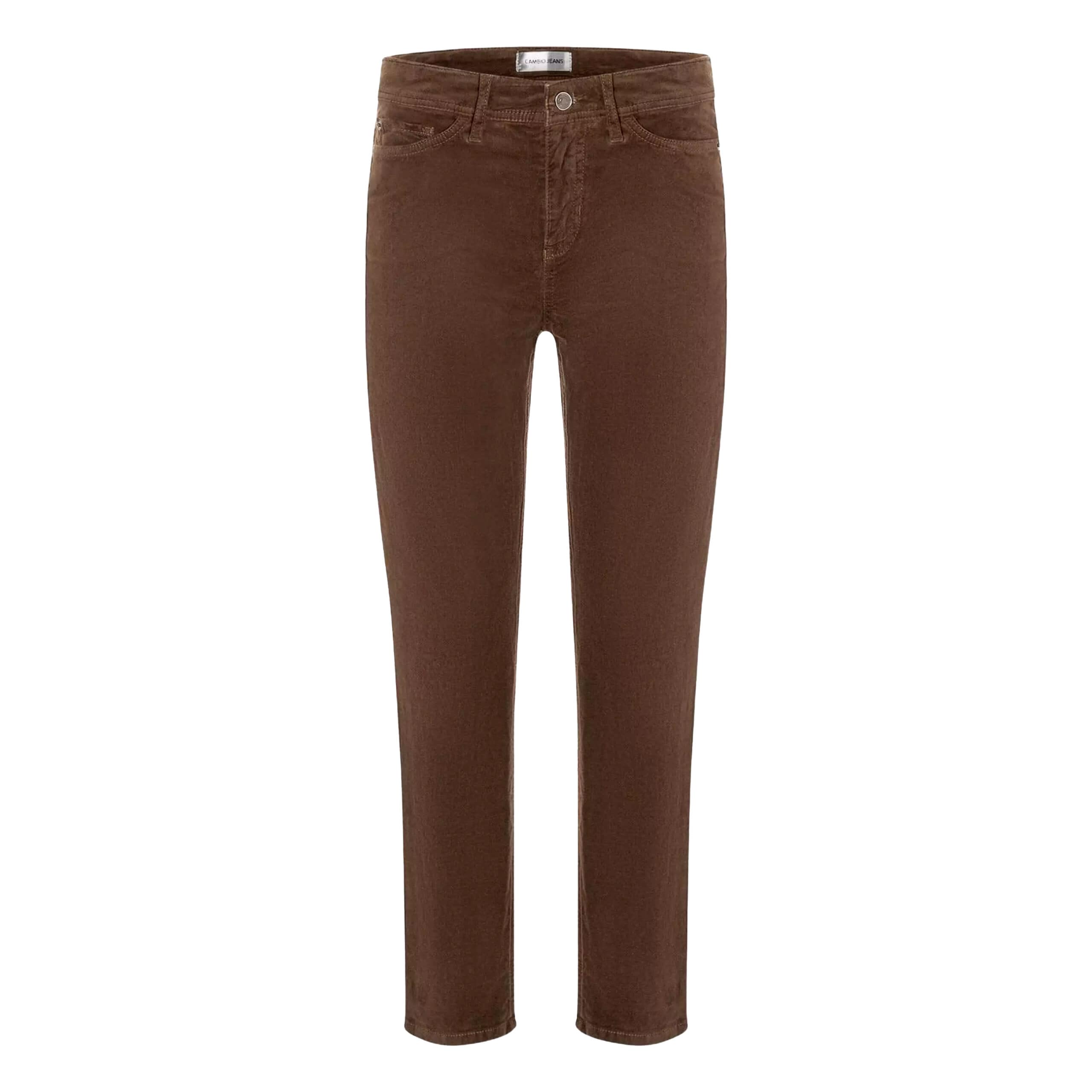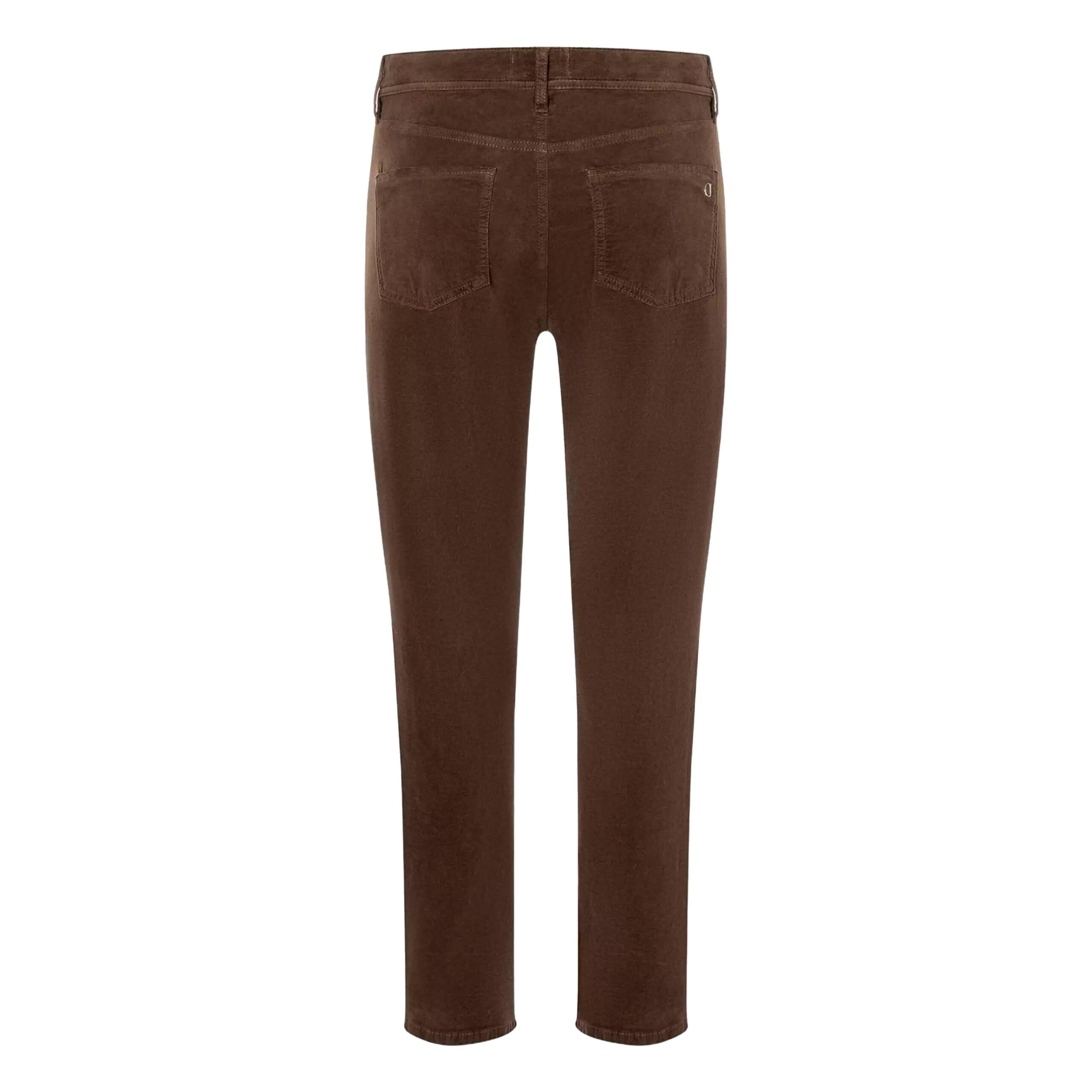 Bruine fluwelen broek van Cambio, model Piper Cropped. Deze broek is gemaakt van een fluwelen stretch stof en heeft een slim fit pasvorm met een normale taille. De velvet broek sluit met een knoop- en ritssluiting en valt tot net boven de enkels.