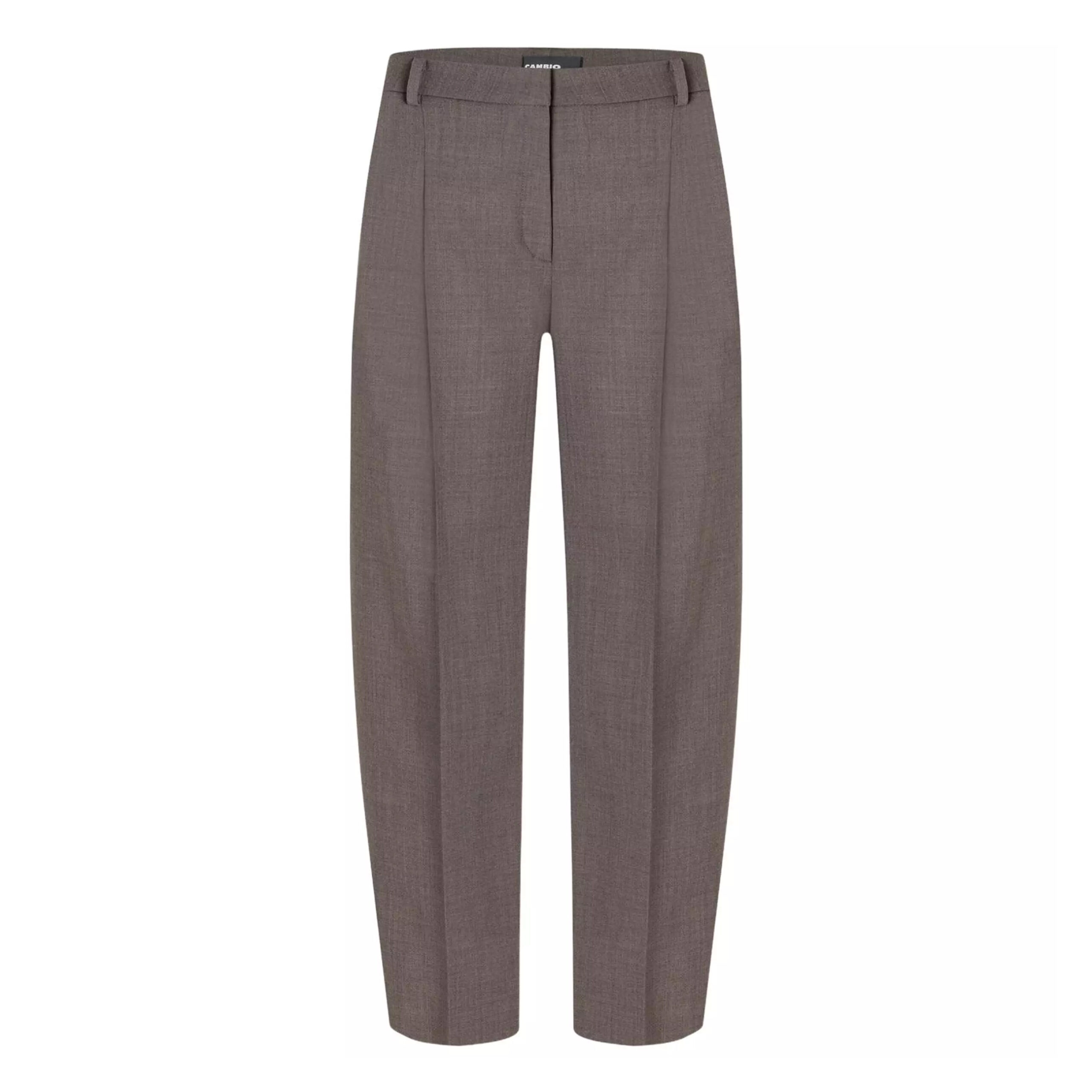 Bruine pantalon van Cambio, model Emilie track. Deze broek is gemaakt van een bruine wollen stretch stof met aan de zijkant een zwart gestreepte bies met CMB. De pantalon sluit met een haakje, knoop- en ritssluiting, heeft twee steekzakken, paspelzakjes, geplooide tailleband en broekspijpen met een lichte barrel pasvorm.