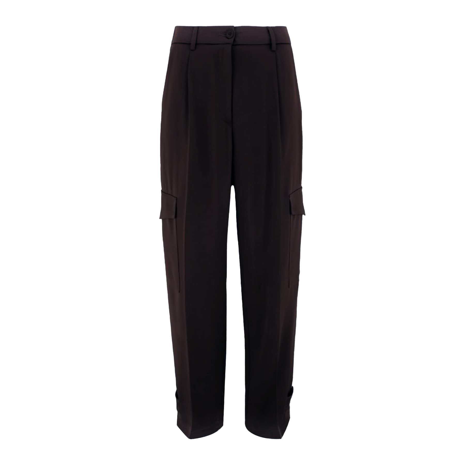 Donkerbruine satijnen pantalon van Cambio, model Koko cargo. Deze broek is gemaakt van een donkerbruine satijnen stof met op de broekspijpen een cargo zak en sluit met een haakje en ritssluiting. De pantalon heeft een hogere taille, rechte wijde broekspijpen met aan de onderzijde knoopjes zodat je deze strakker kunt maken, twee steekzakken en twee sier paspelzakken.