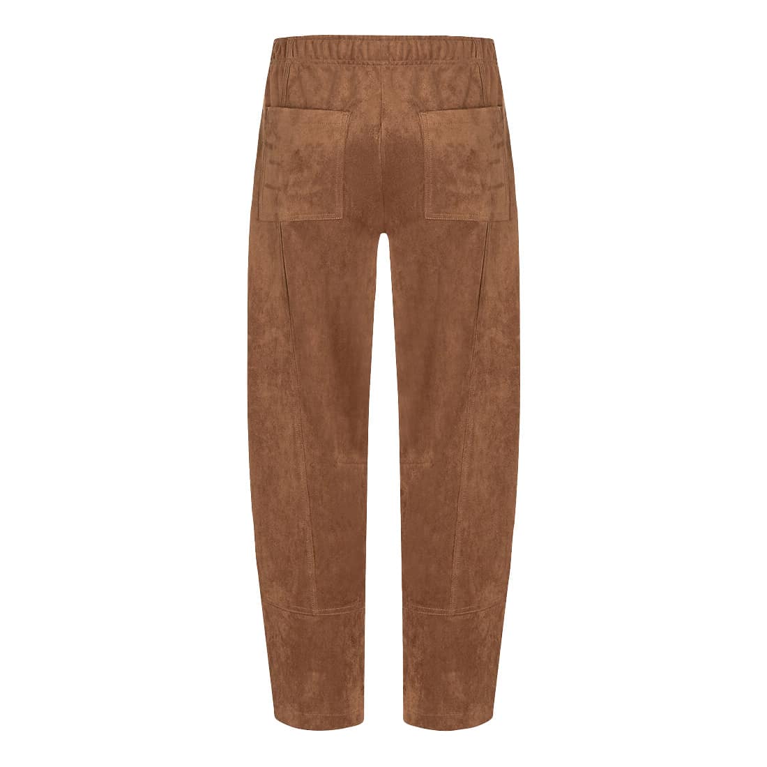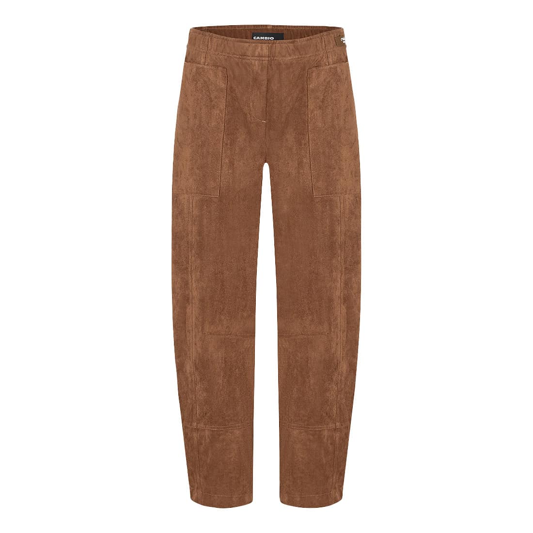 Bruine pantalon van Cambio, model Ophelia in cognac. Deze broek is gemaakt van een bruine stretch stof met een suède look, heeft wijde broekspijpen met een lichte ballonvorm en een hoge taille. De pantalon heeft een elastische taille, twee steekzakken en twee achterzakken.