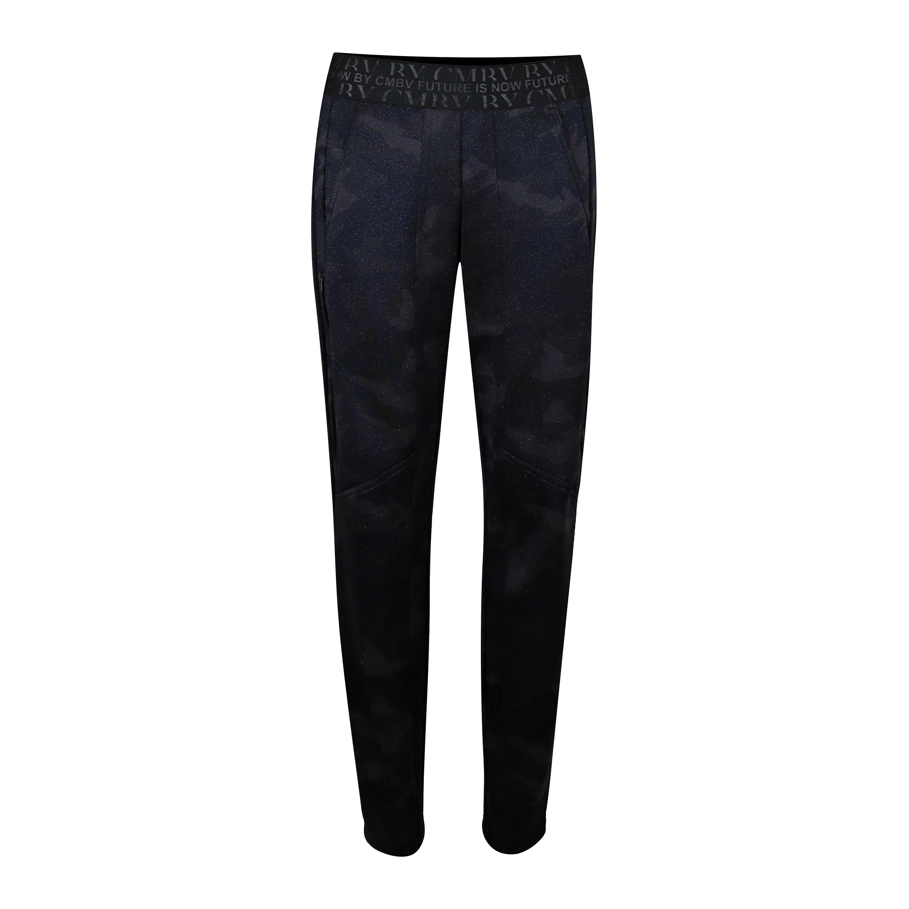 Relaxte pantalon van Cambio, model Jorden Pure. Deze broek heeft een zwarte elastische taille, taps toelopende broekspijpen, twee steekzakken en twee sier paspel zakken aan de achterzijde. De broek is gemaakt van een zwart bruine camouflage stretch stof met een glimmertje.