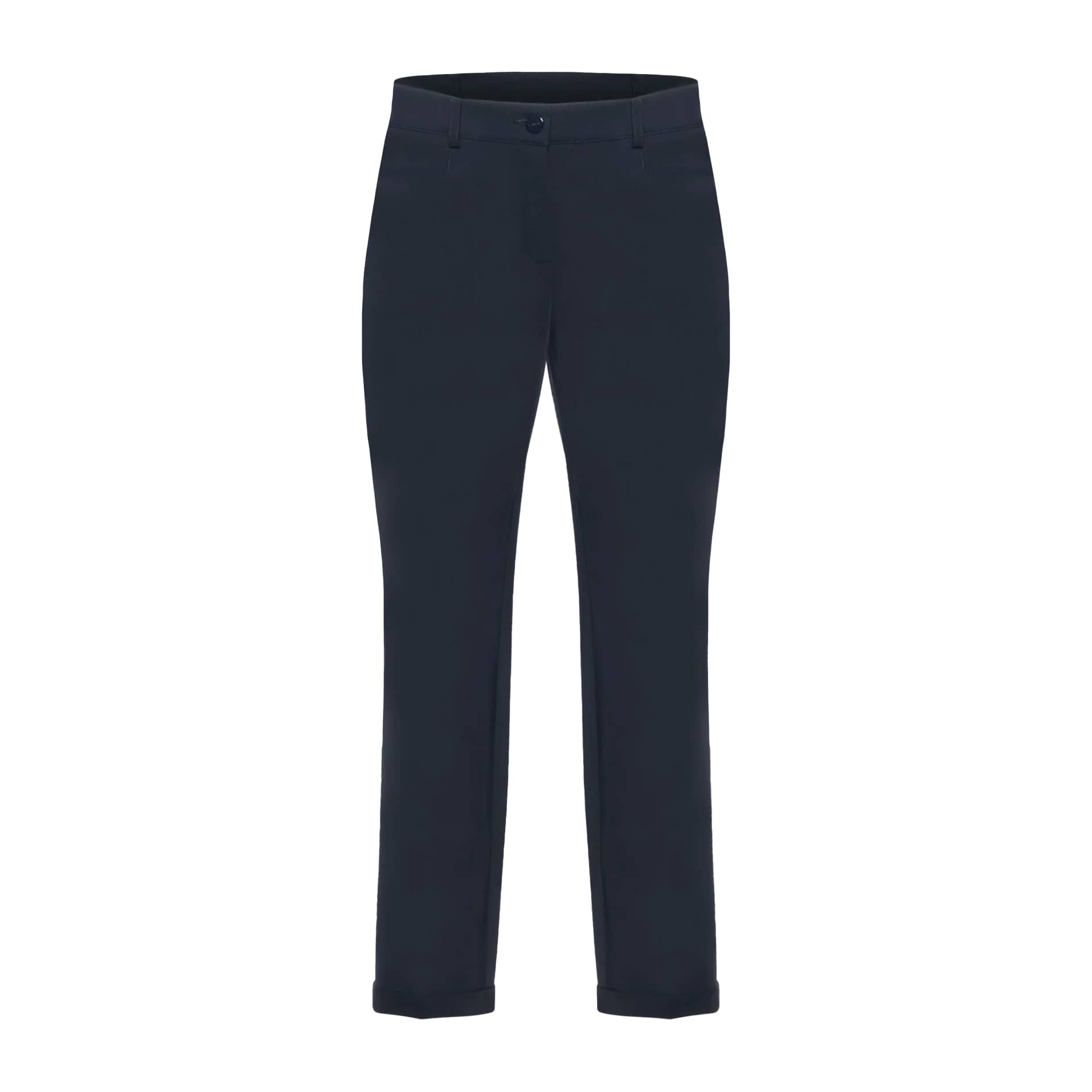 Donkerblauwe pantalon van Cambio, model Kathreen. Deze broek is gemaakt van een gladde stretch stof, heeft toelopende broekspijpen en een 7/8 lengte met een vaste omslag. De pantalon sluit met een knoop- en ritssluiting en heeft twee steekzakken en twee sier paspelzakjes.